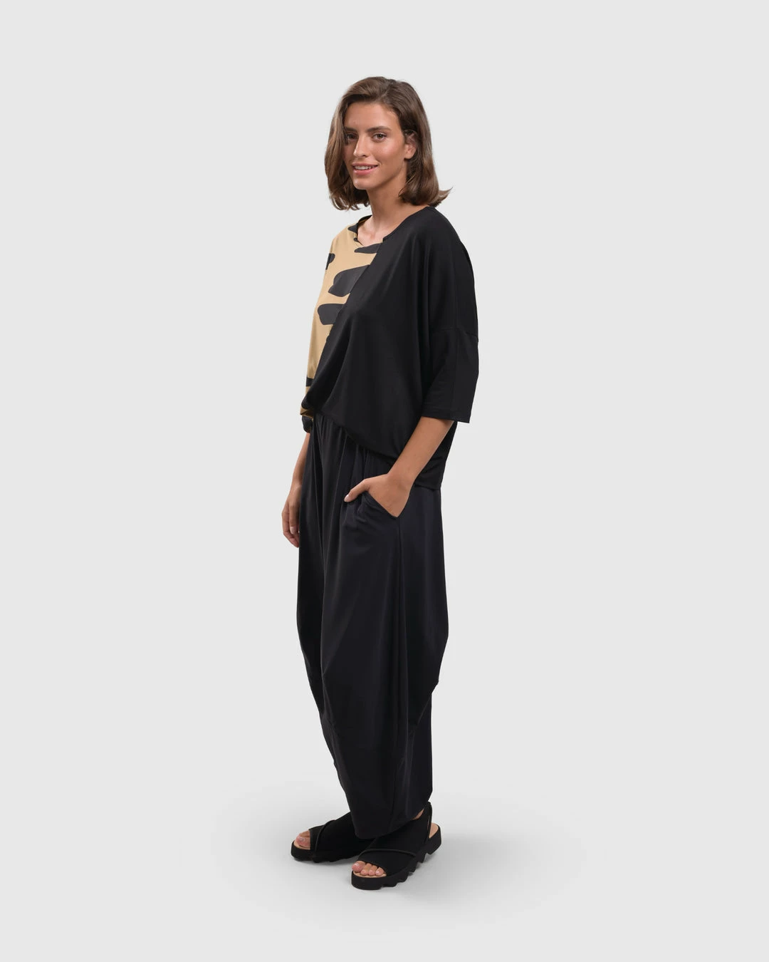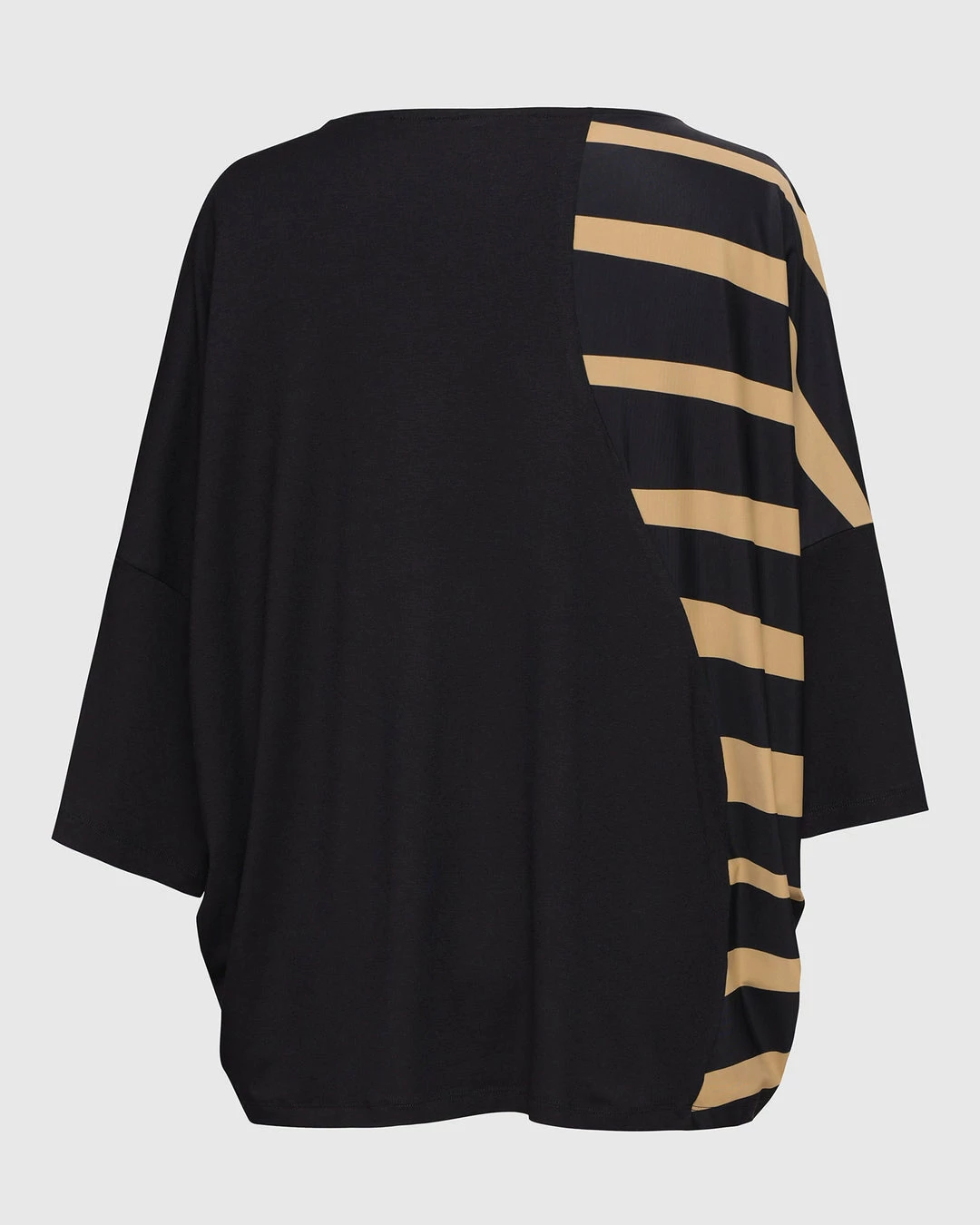 A favorite silhouette from Alembika, this relaxed top has a roomy body that tapers to hemline, creating a side drape. It’s finished with a round neckline and short dropped sleeves. In a mixed body of jersey knit, it features a wavy seamed accent panel at one side in bold striped Tekbika stretch knit.