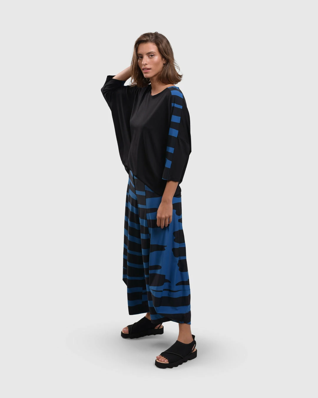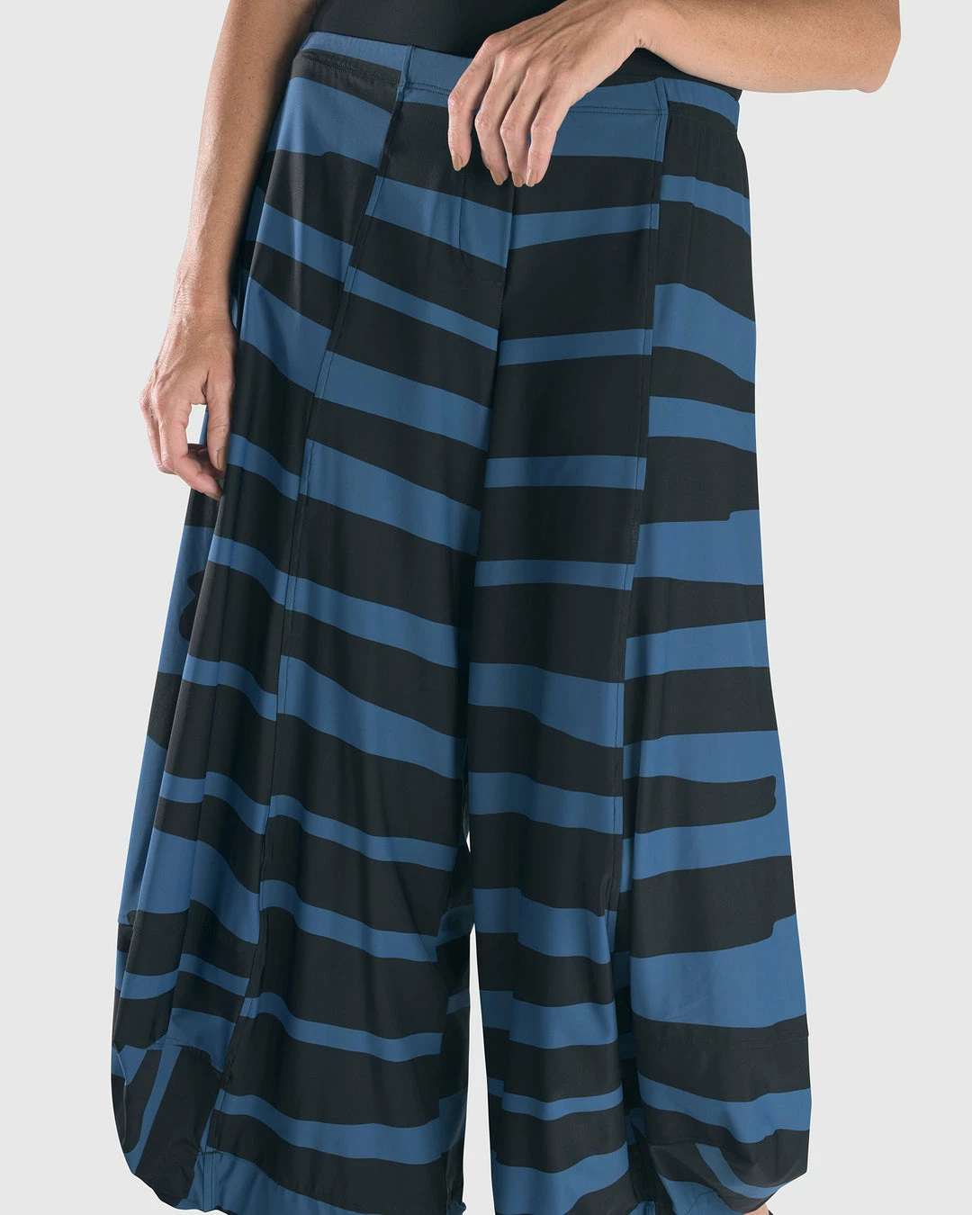 An Alembika favorite and signature silhouette, the punto pant style has seam detail ballooned legs with faux fly detail at elastic stretch pull on waist. In a bold striped print in signature Tekbika fabric.