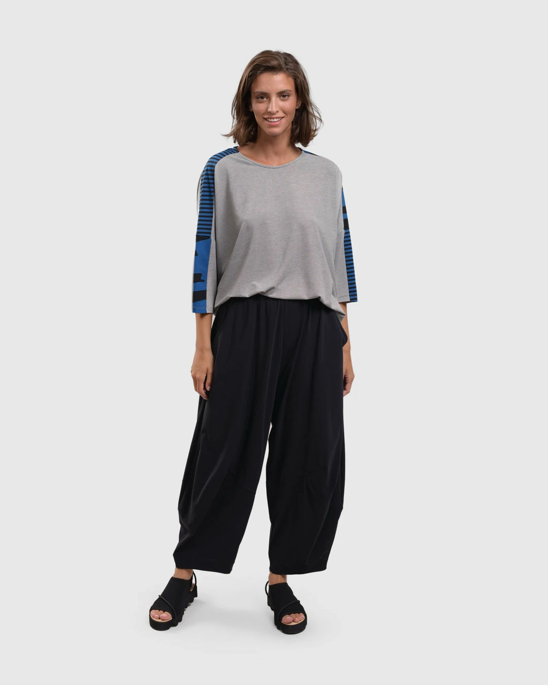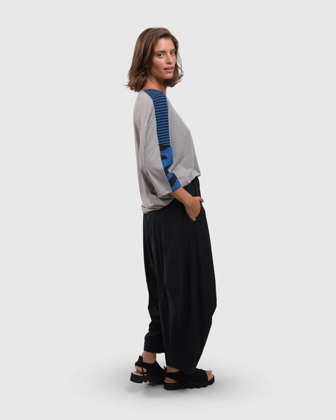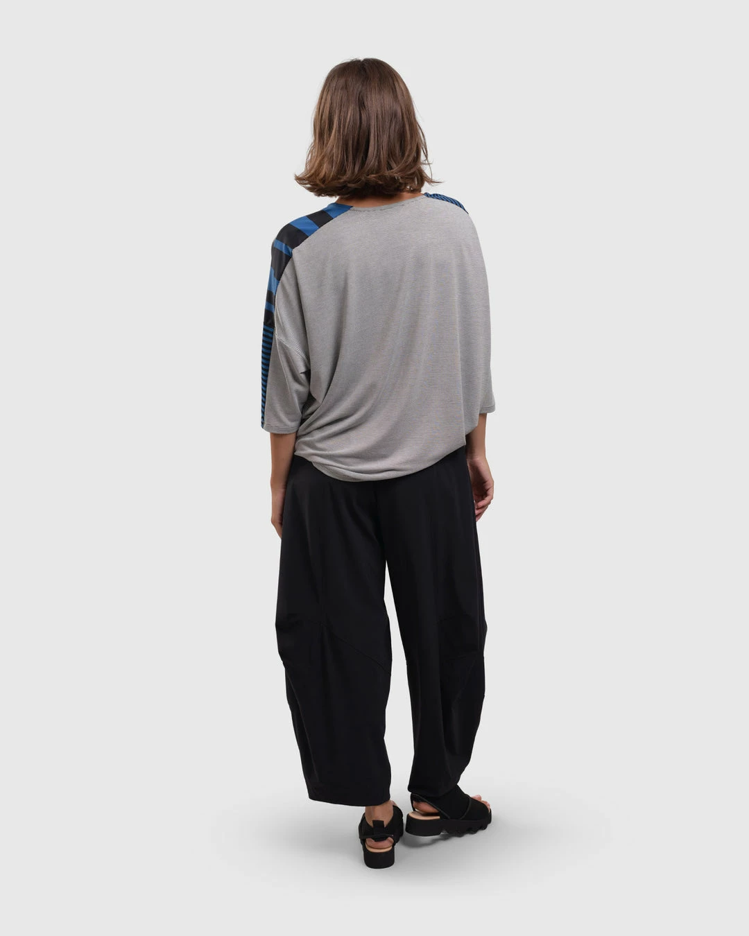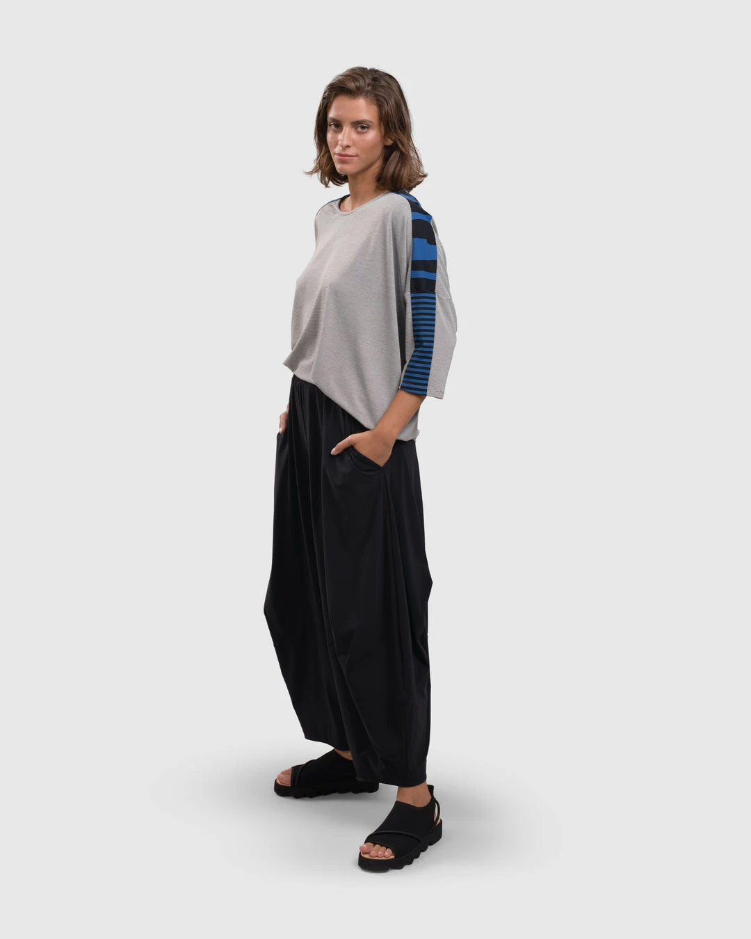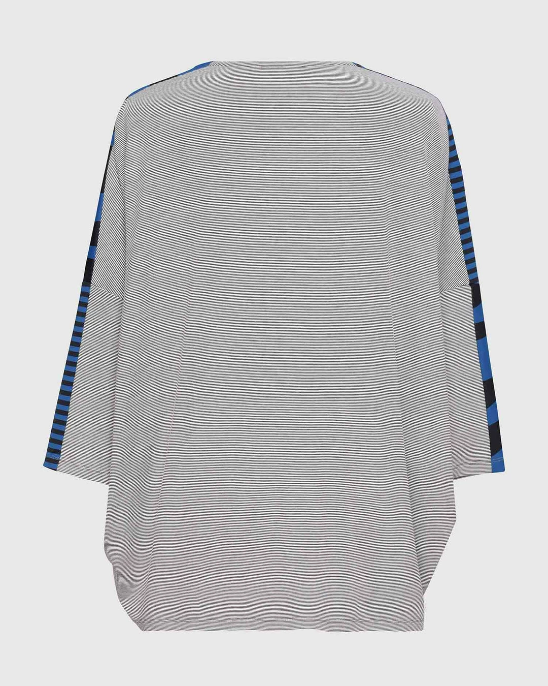 A favorite silhouette from Alembika, this relaxed top has a roomy body that tapers to hemline, creating a side drape. It’s finished with a round neckline and short dropped sleeves. With a body in pinstripe jersey knit, it features Tekbika striped accent panels at shoulders and sleeves.