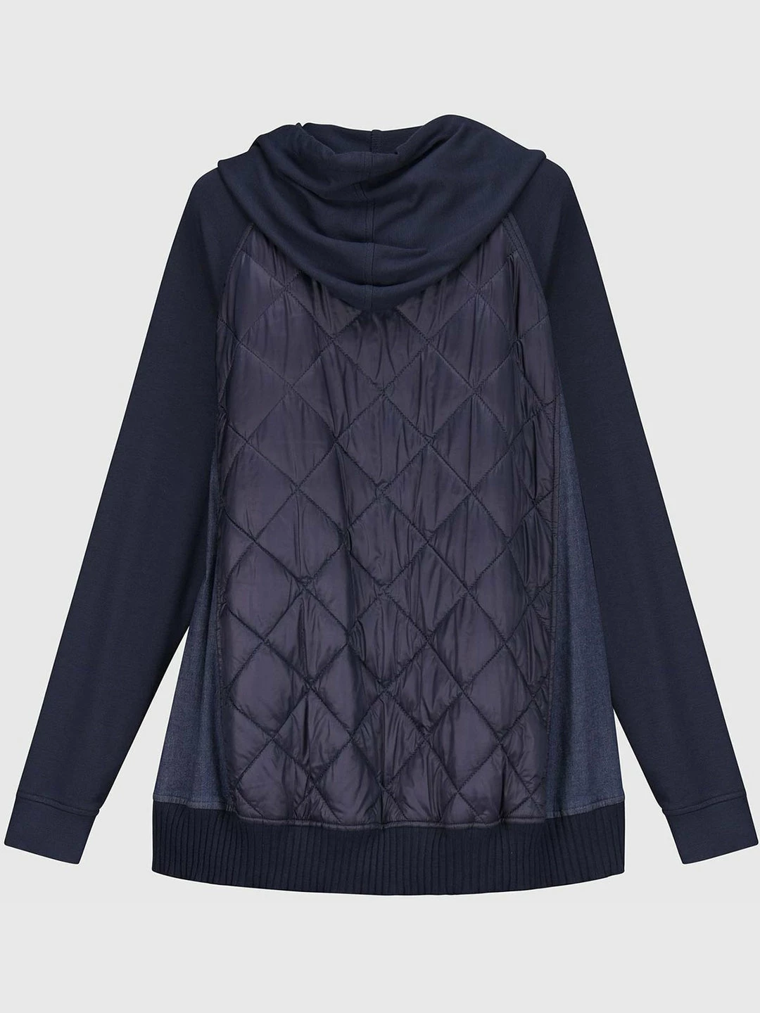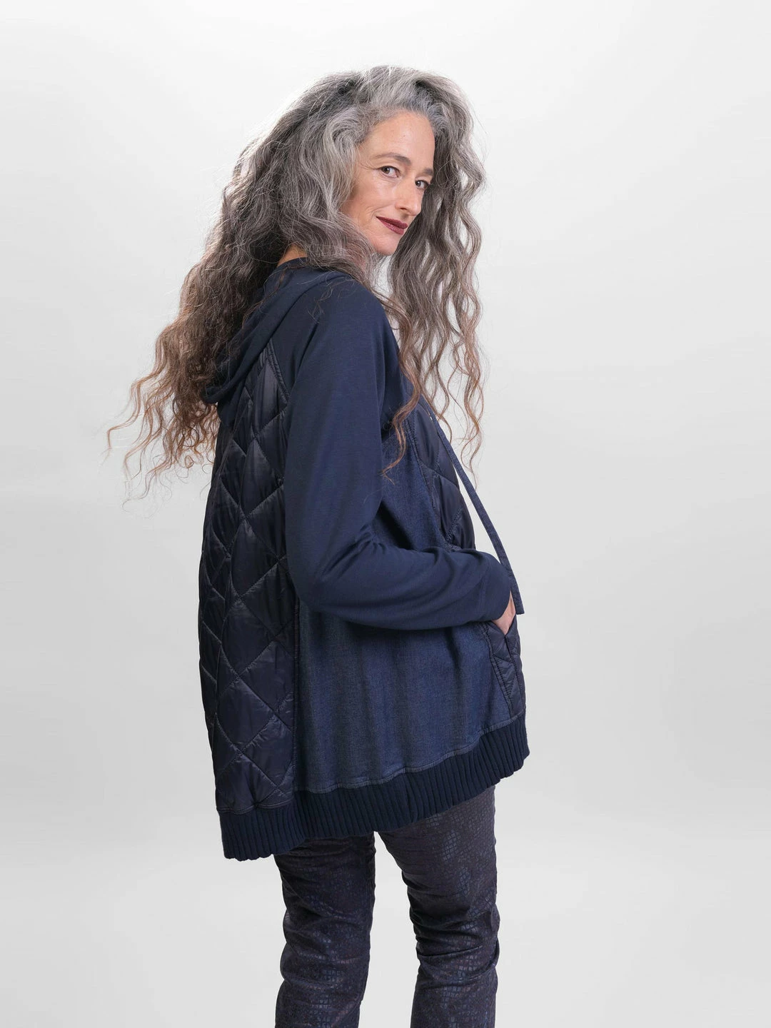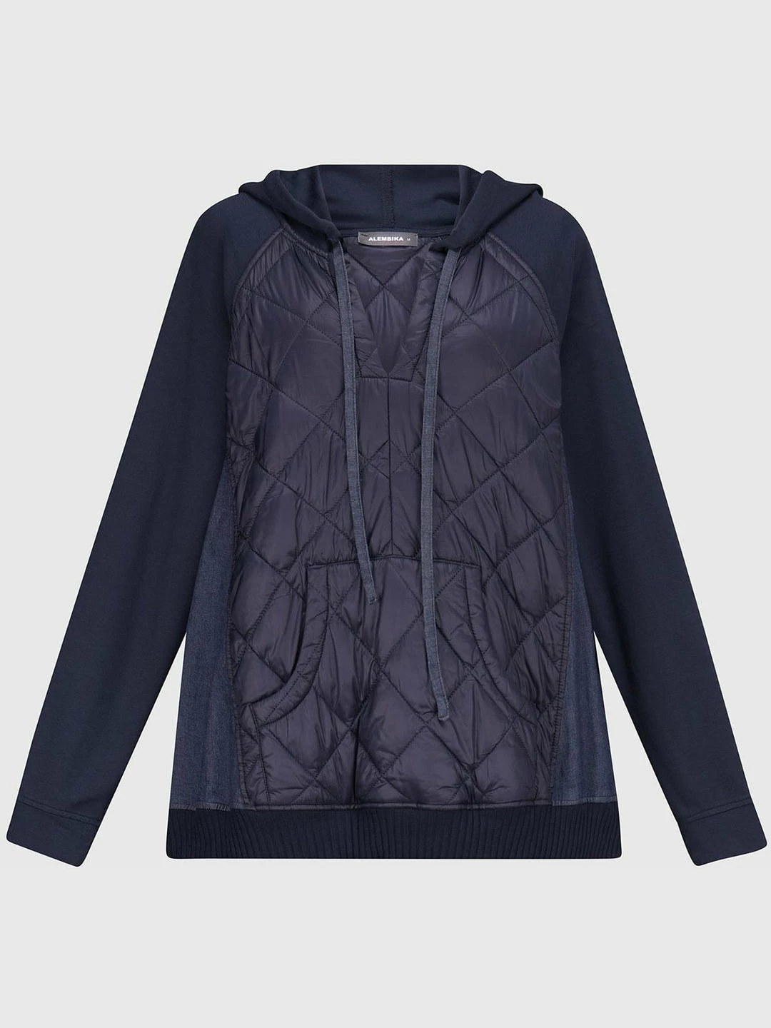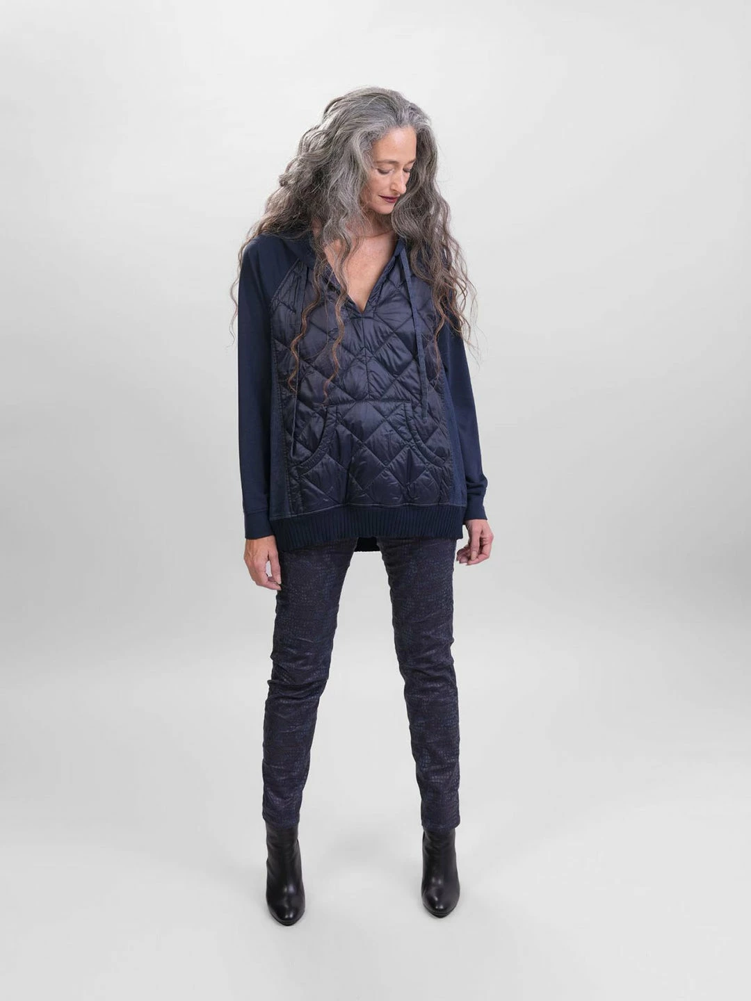 Alembika’s jean styles always stand out and this casual chic style is no different! In a mixed body of denim and coordinating quilted fabric, along with solid knits, it has a roomy relaxed body with drawstring detail at the hooded neckline. A round kangaroo style pocket and raglan set long sleeves complete the look. Ribbed knit trim at the even hemline adds the finishing touch.