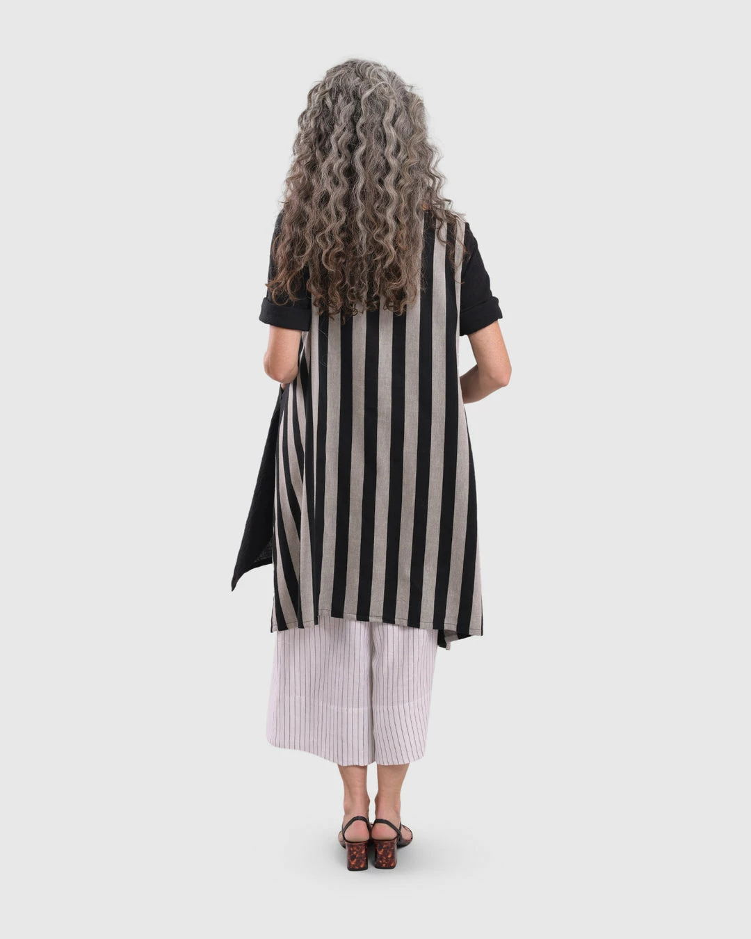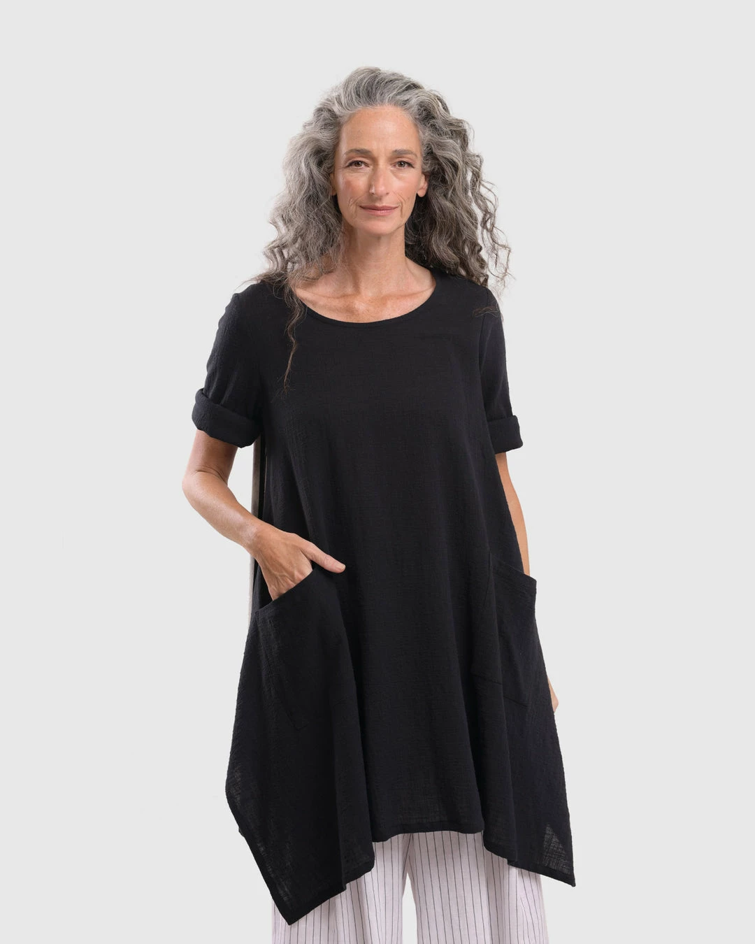 This breezy tunic has a roomy relaxed body and features a striped woven back with solid gauze at front. Accent pockets, a round neckline and high low hemline with angled side vents complete the look.