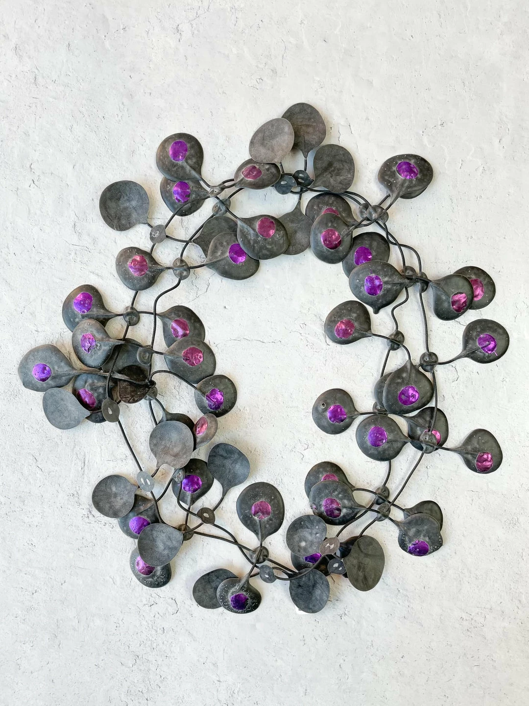 Large rubber “petals” with a colored metallic foil center are tied along thin black stretch cord. Wear long, doubled up or tripled as a collar – even wrap around the wrist as a bracelet! Have fun layering multiple styles and colors to create a truly unique look!
