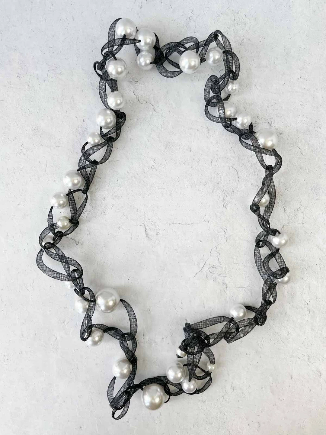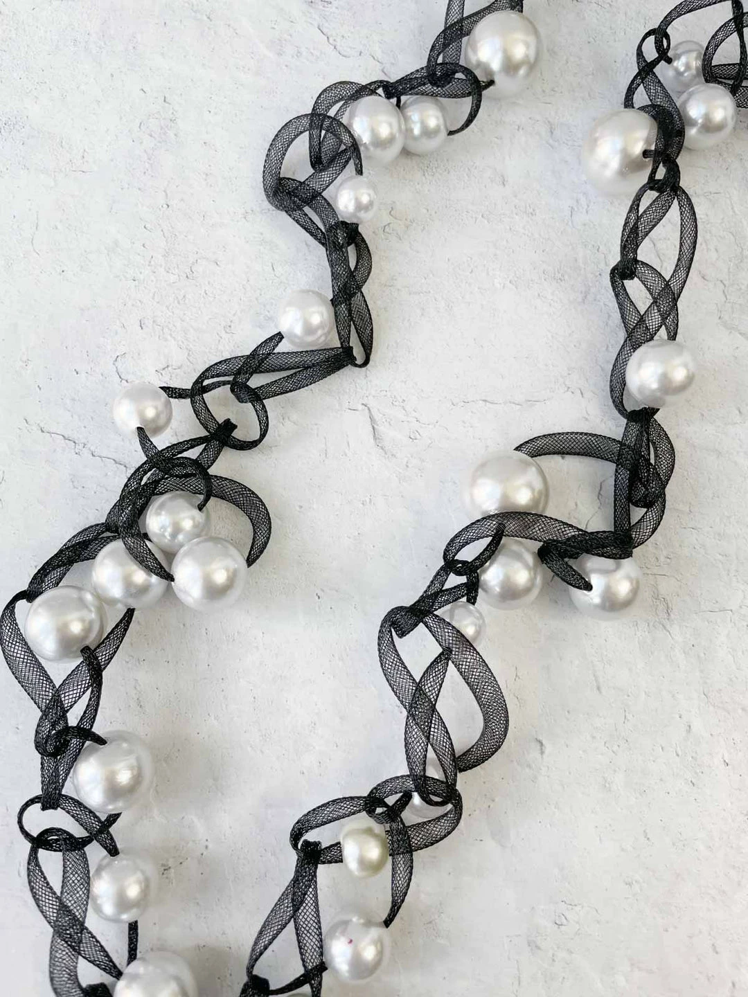 This style features various sized pearls on tulle cord that is knotted and linked. Wear long or doubled around the neck.