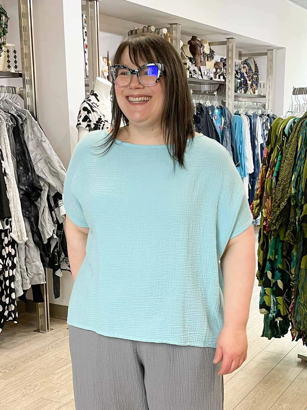 The Bess Shirt from Bryn Walker is the perfect summer top in easy cotton gauze. It has a boxy body with cap sleeves, even hemline and higher rounded neckline.