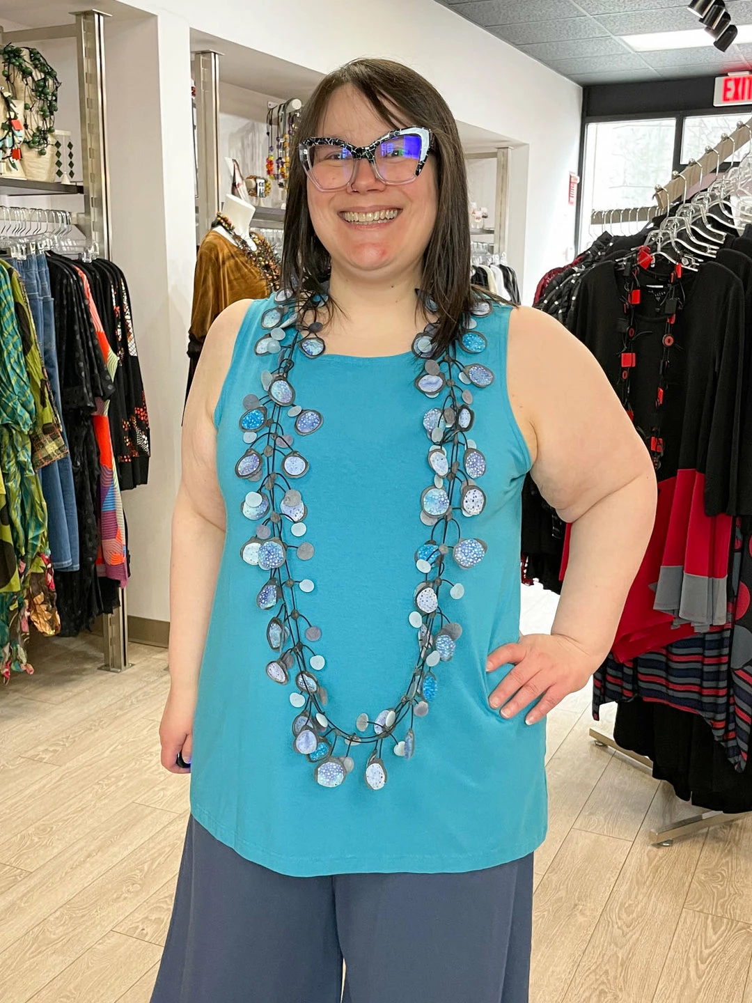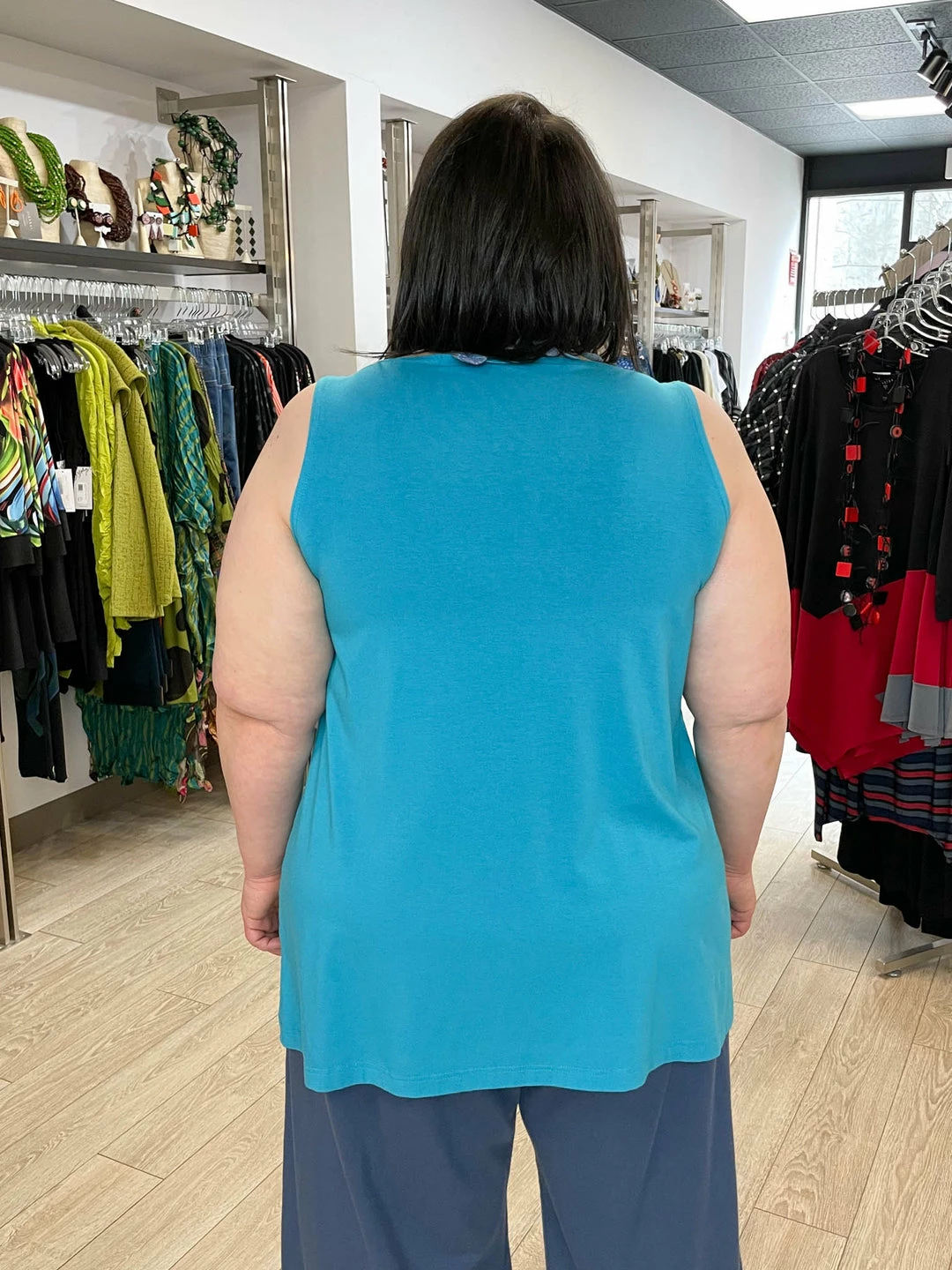 Karen (size 18 top, 14 bottom, 5’4″) wears size XL.