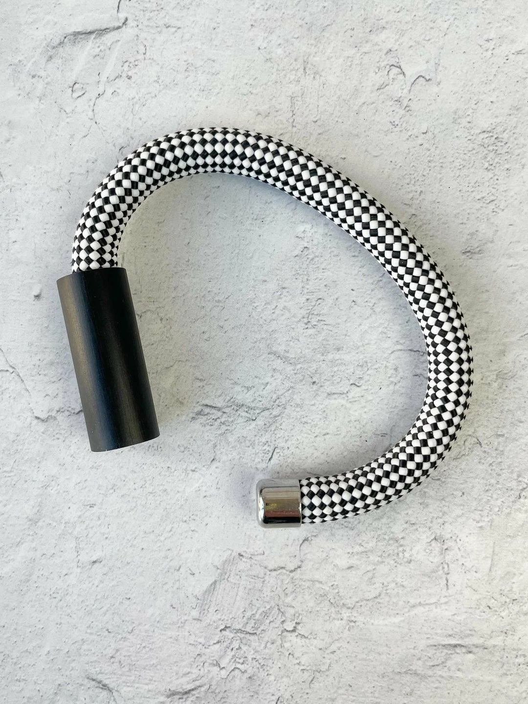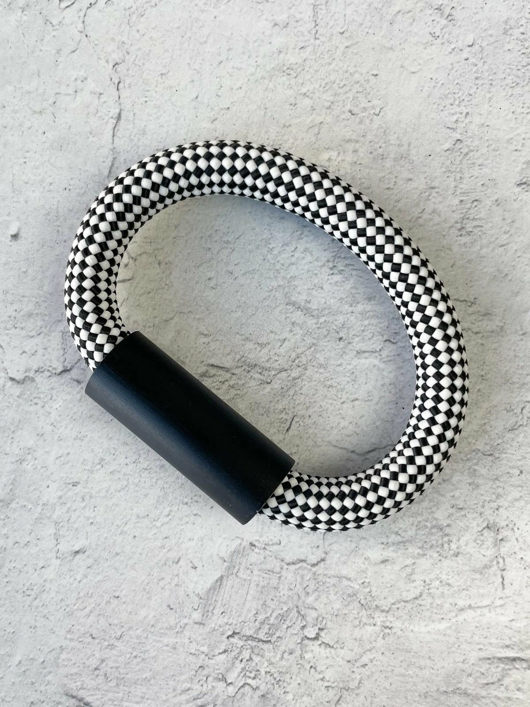 This stackable style features an aluminum tube centerpiece along woven cord. Hidden magnet clasp for easy on and off.