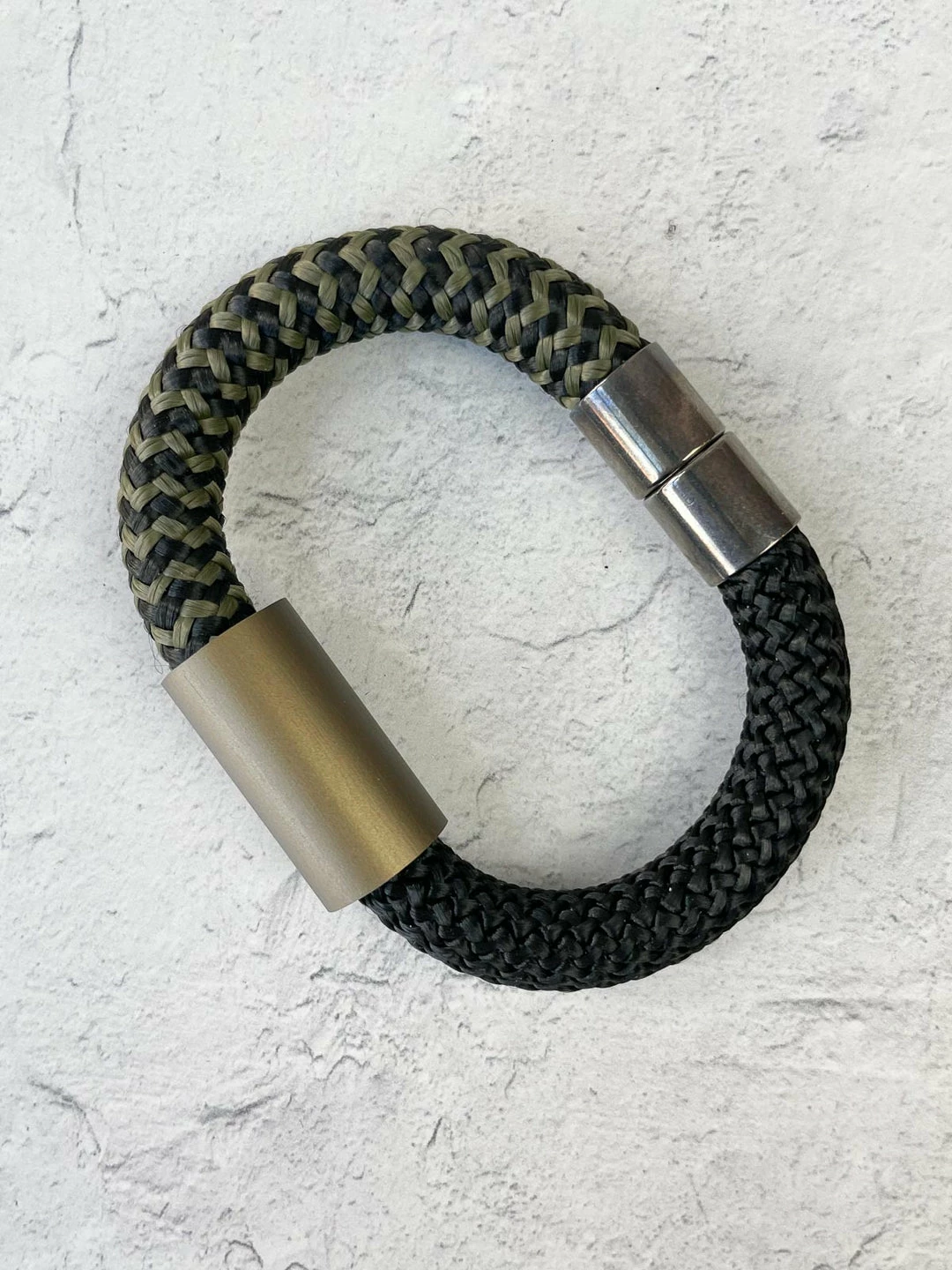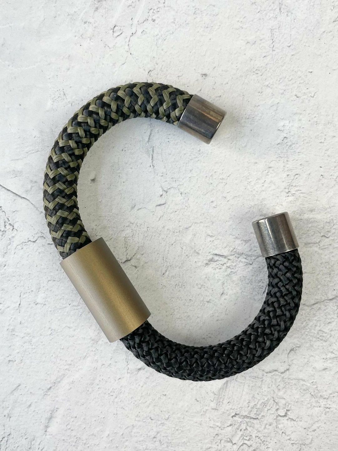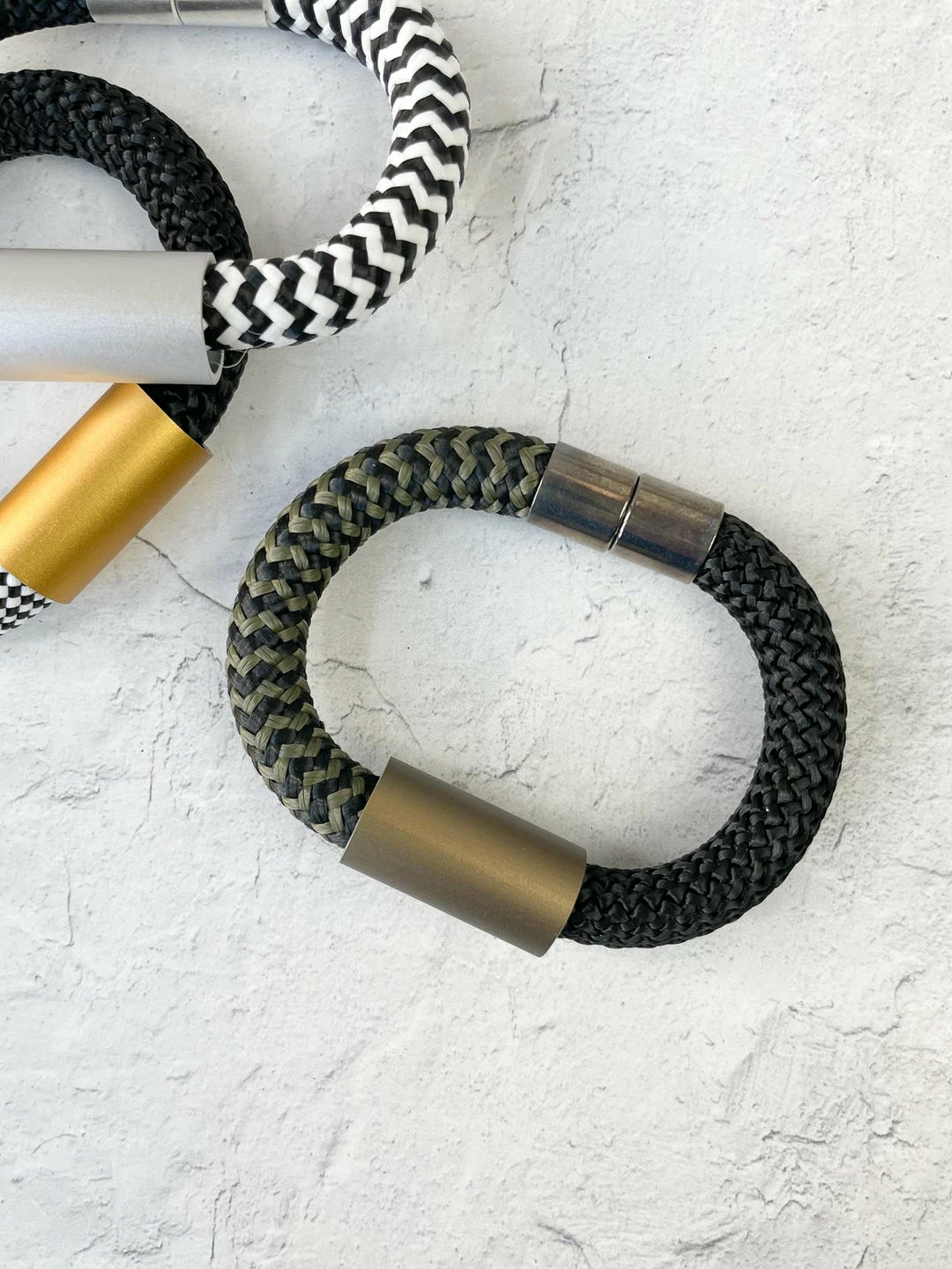 This stackable style features an aluminum tube centerpiece along a mix of solid and patterned woven cord. Magnet clasp at back for easy on and off.
