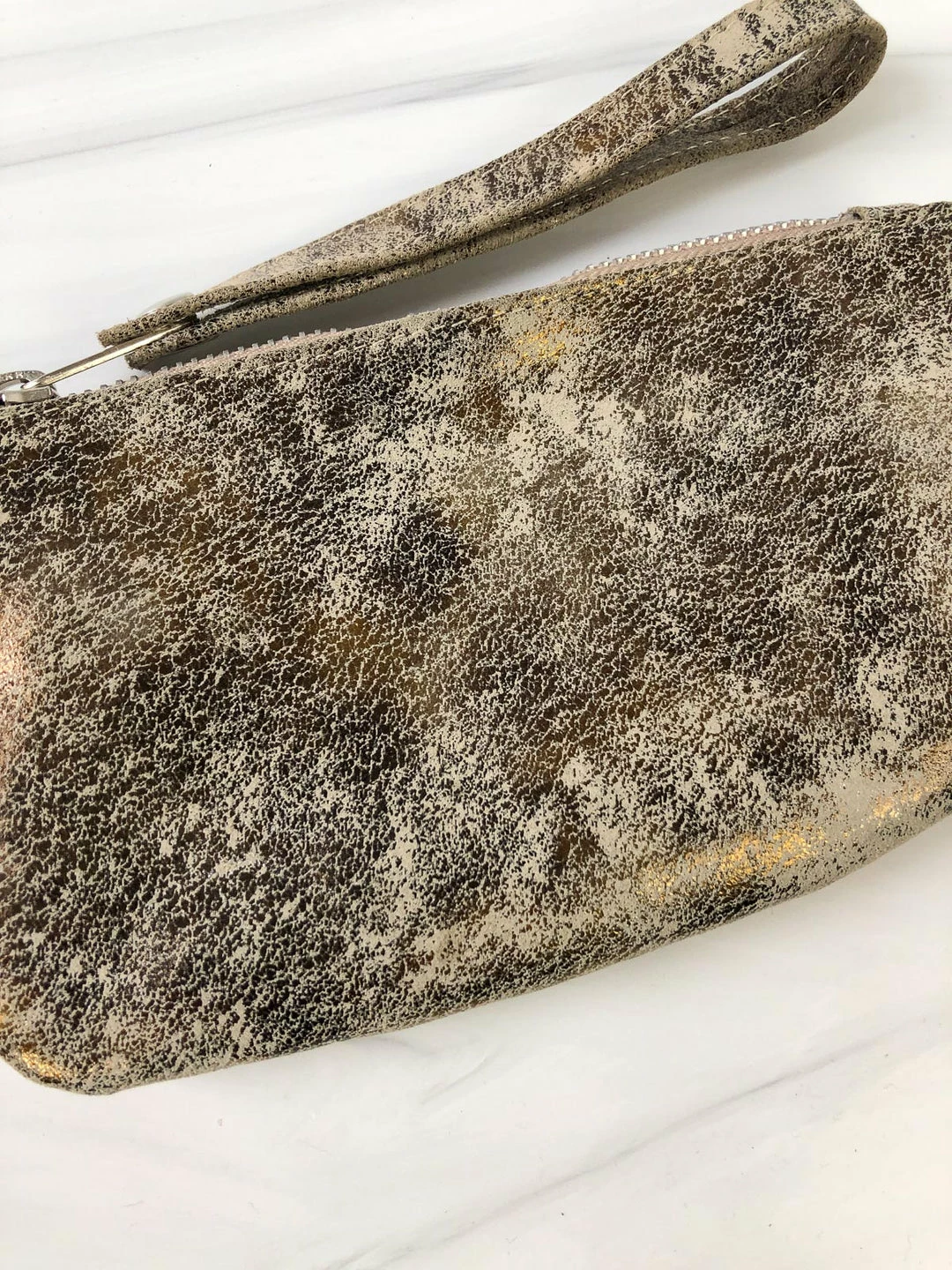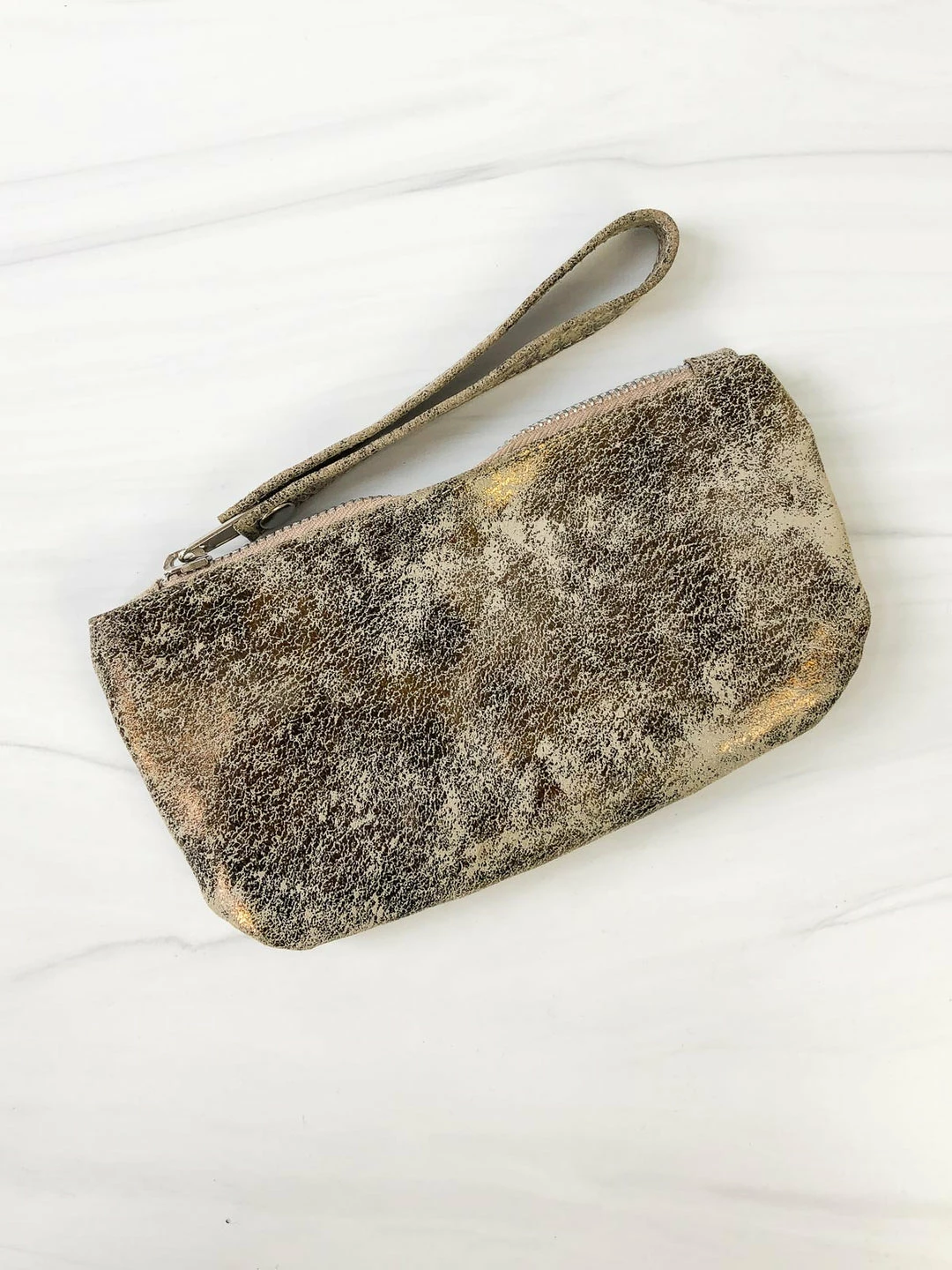 This small wristlet is the perfect size to carry your cellphone and a few essentials. Top zip closure has attached wristlet strap. Interior of black fabric with zipper pocket.