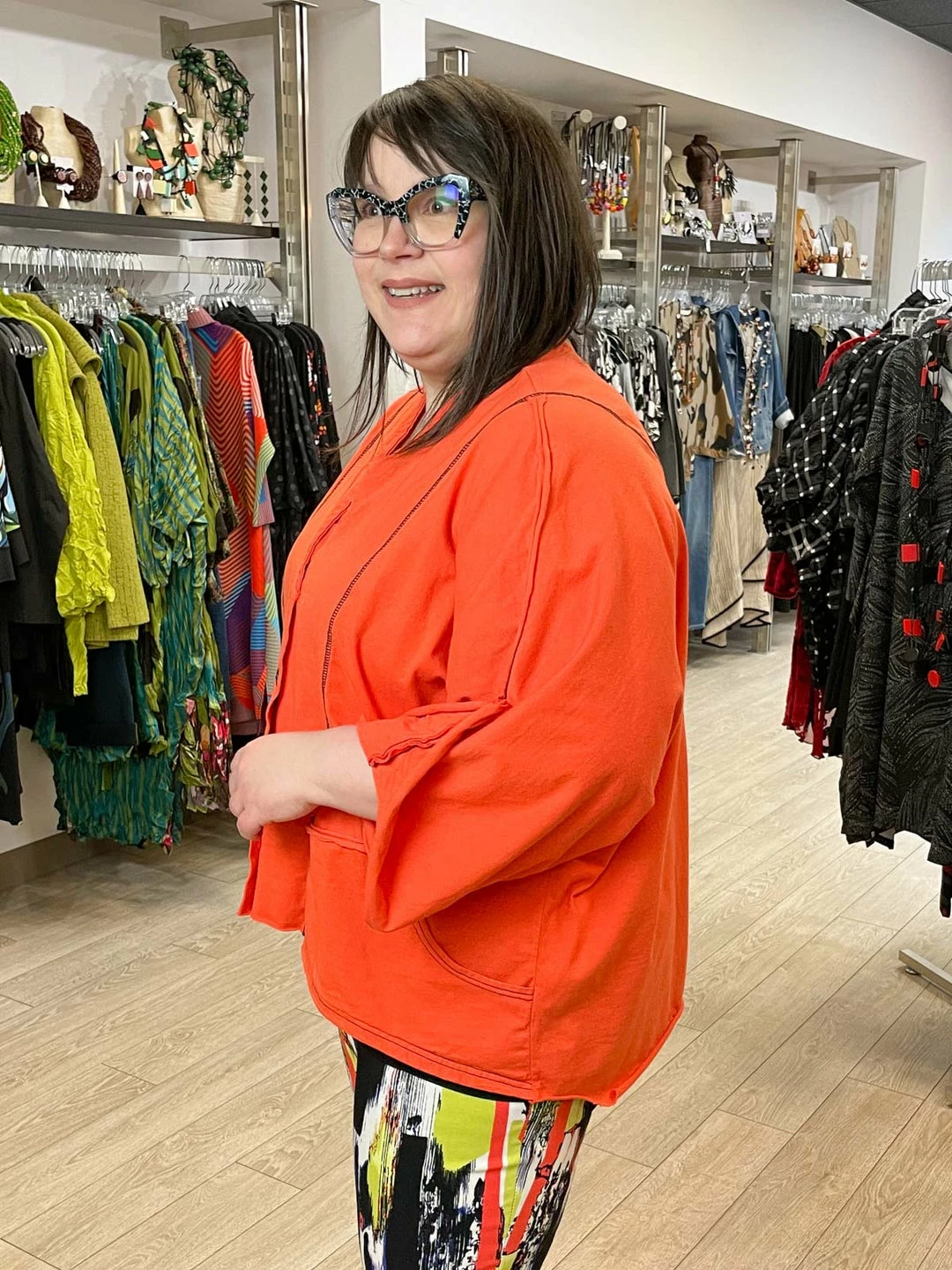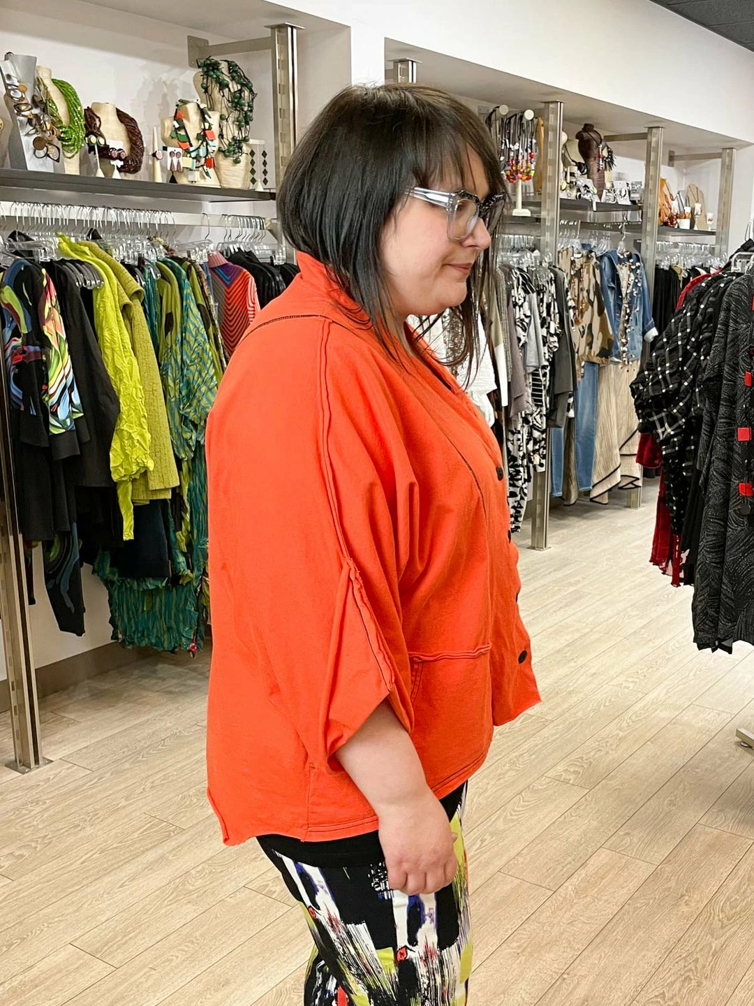 Cynthia Ashby’s Ellipse Jacket has features the overstitch and raw seam details at both front and back, that are signature to the brand. This oversized boxy body has a button front with v collar neckline, wide dolman sleeves and side pockets. You’ll find contrast stitched seams at both the front and back, along with unfinished detailing throughout, including the sleeves.
