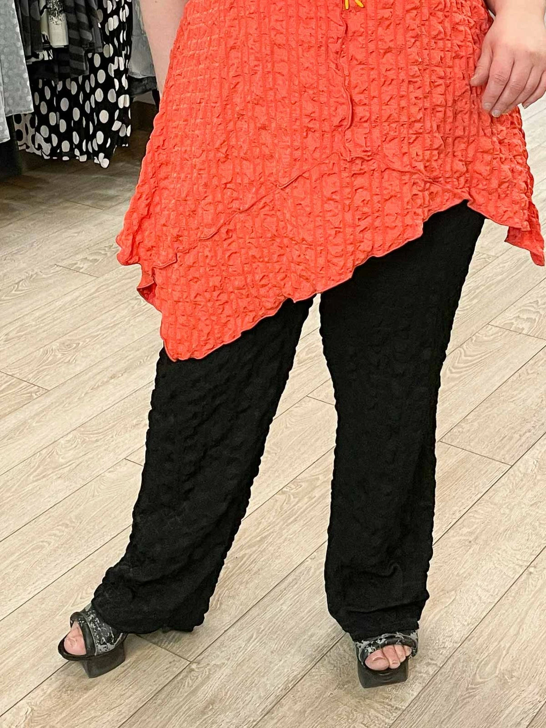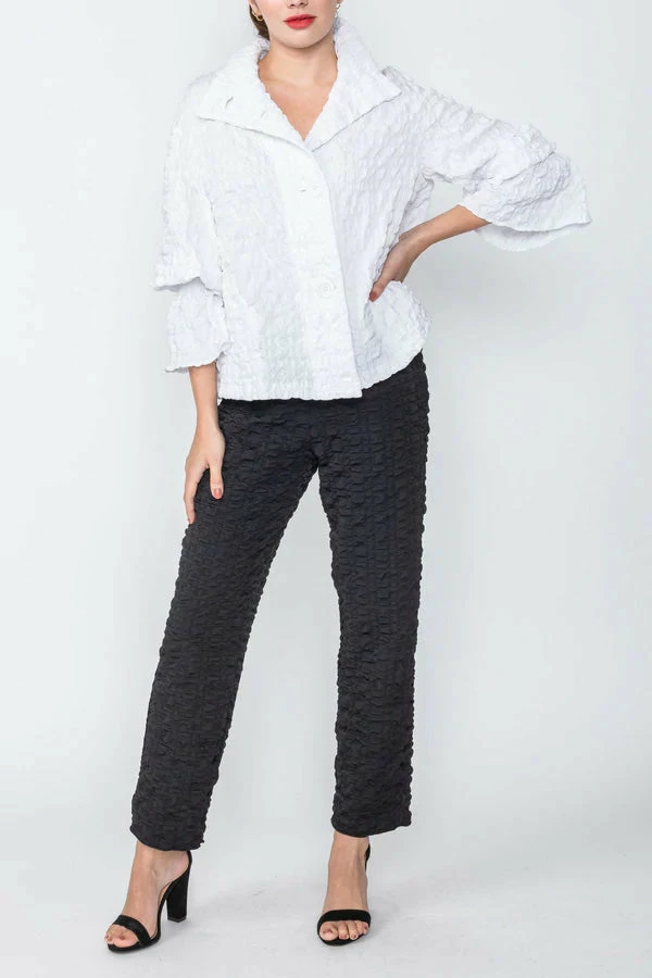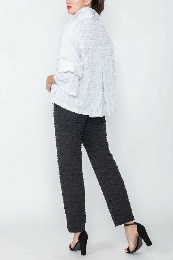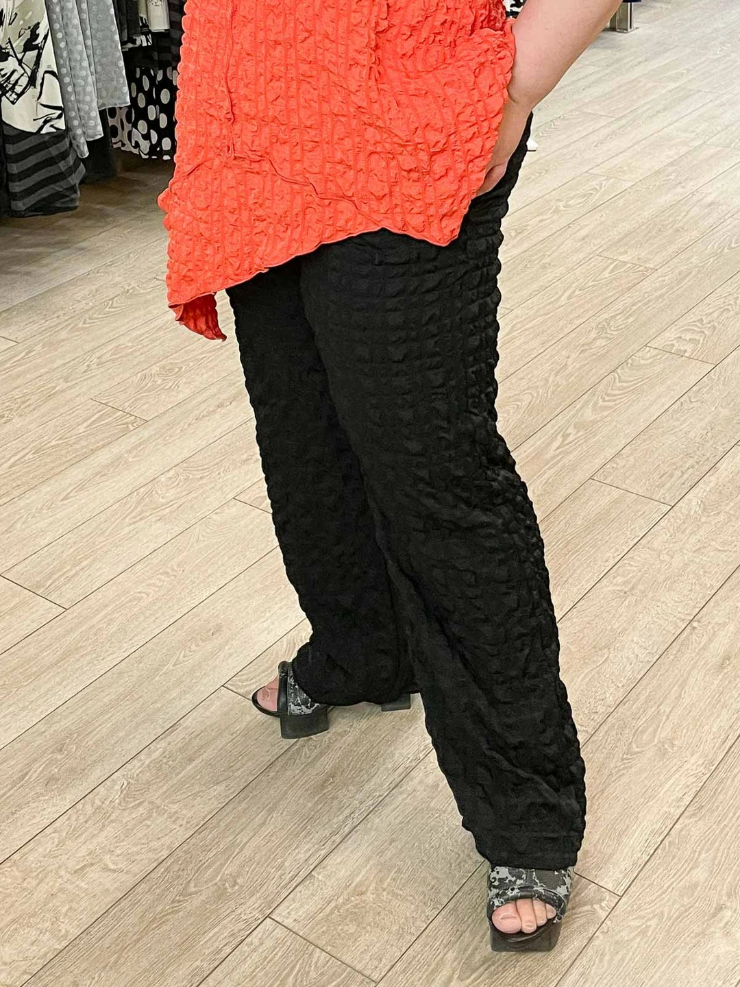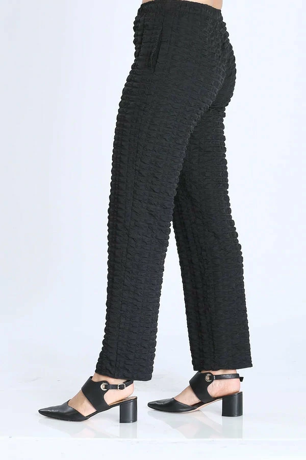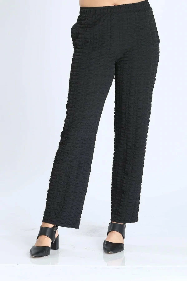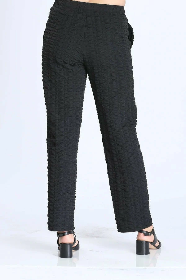 These not so basic pants stand out in a puckered check pattern stretch woven. With a relaxed tapered leg silhouette and stretch pull on waist with slash side seam pockets, these are the perfect option to dress up or down.