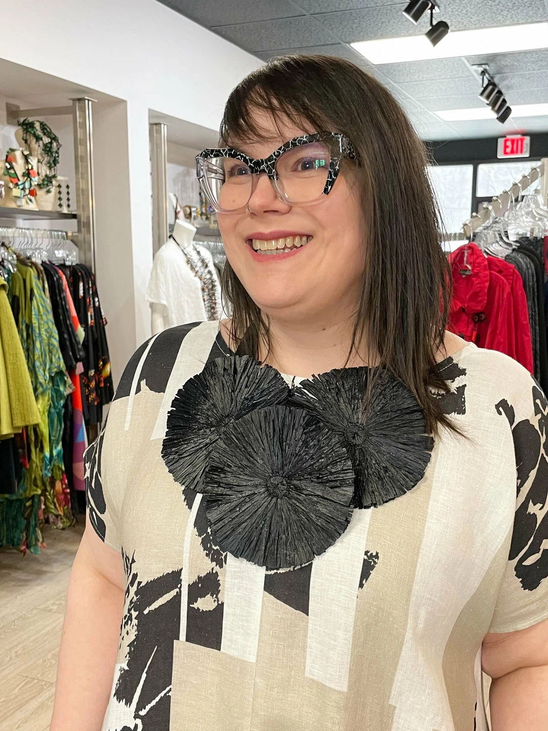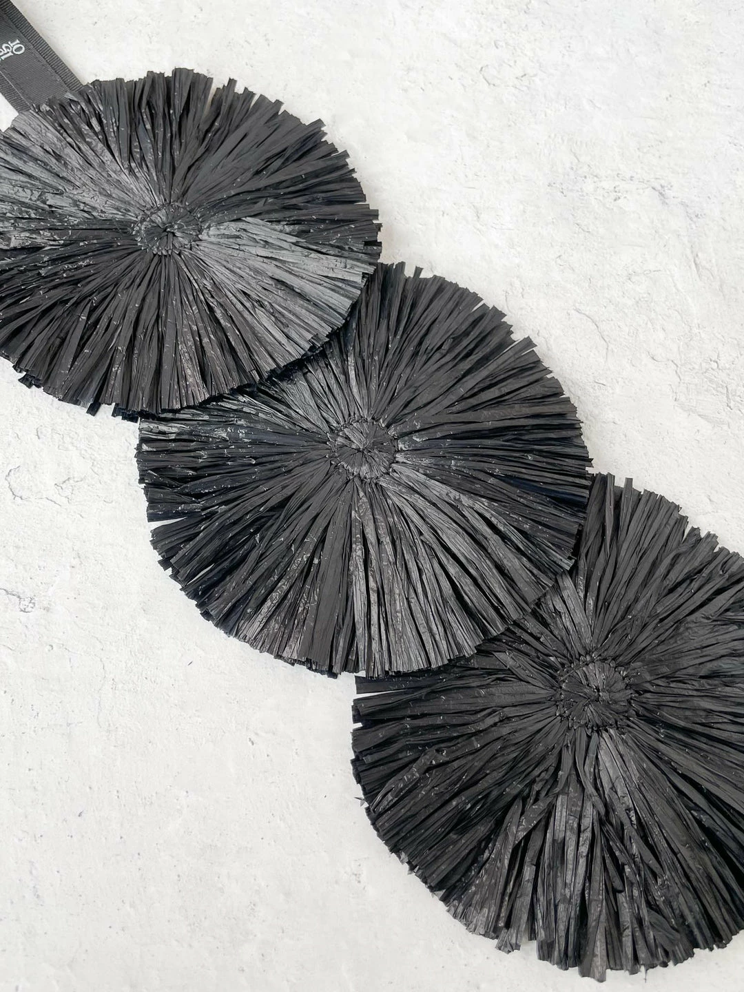 This versatile accessory can work as a statement necklace or tie belt. With three raffia flowers along coordinating grosgrain ribbon, this can be tied as you’d like.
