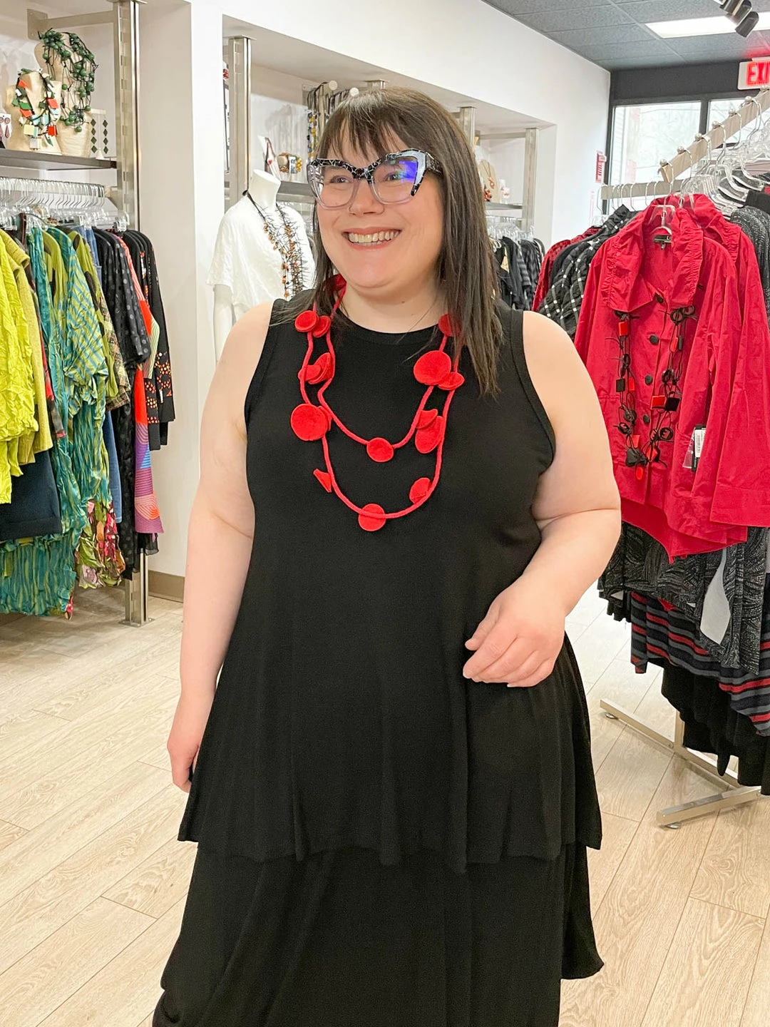 Andrea (size 14/16, 5’3″) wears size 2, but could easily wear size 3 to have a bit more room through the bust and upper back.