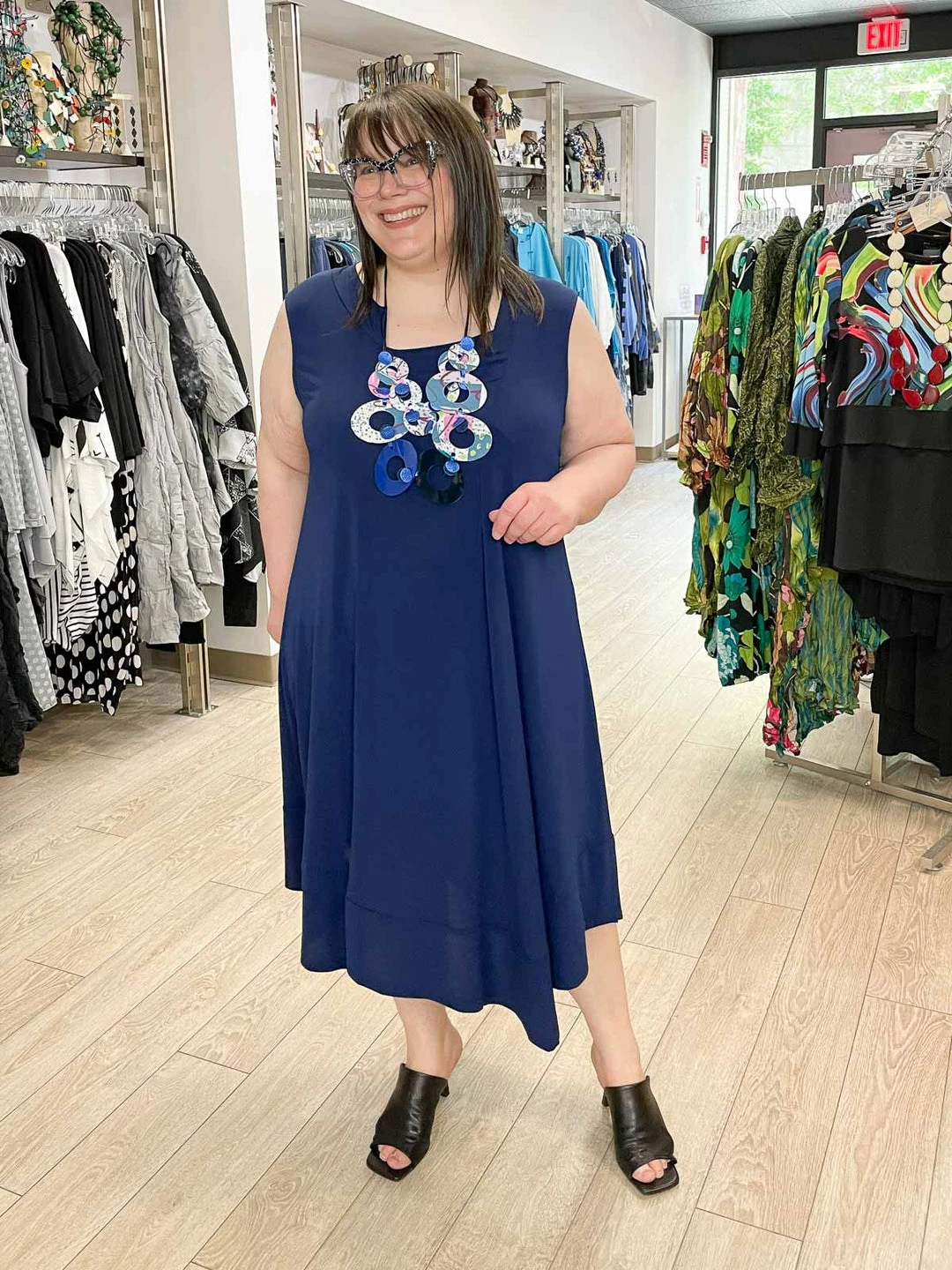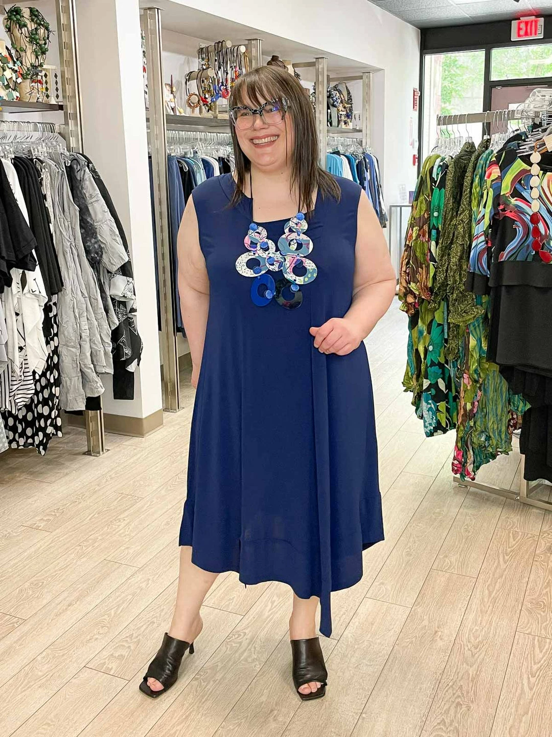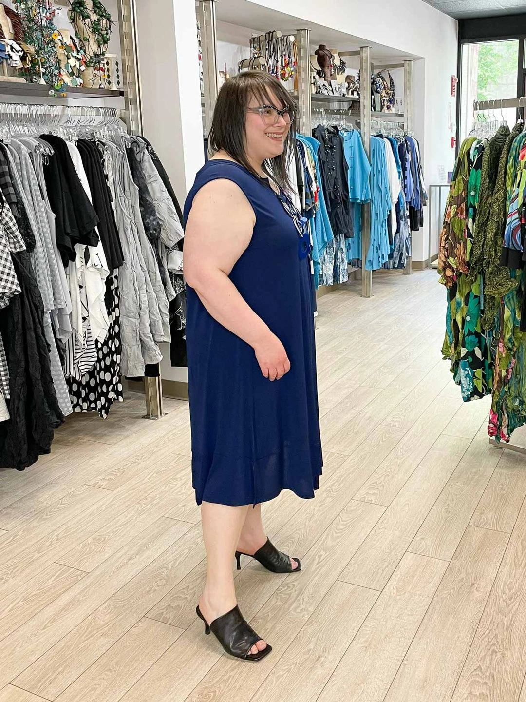 Andrea (size 14/16, 5’3″ ) models size XL, but can also wear size L.