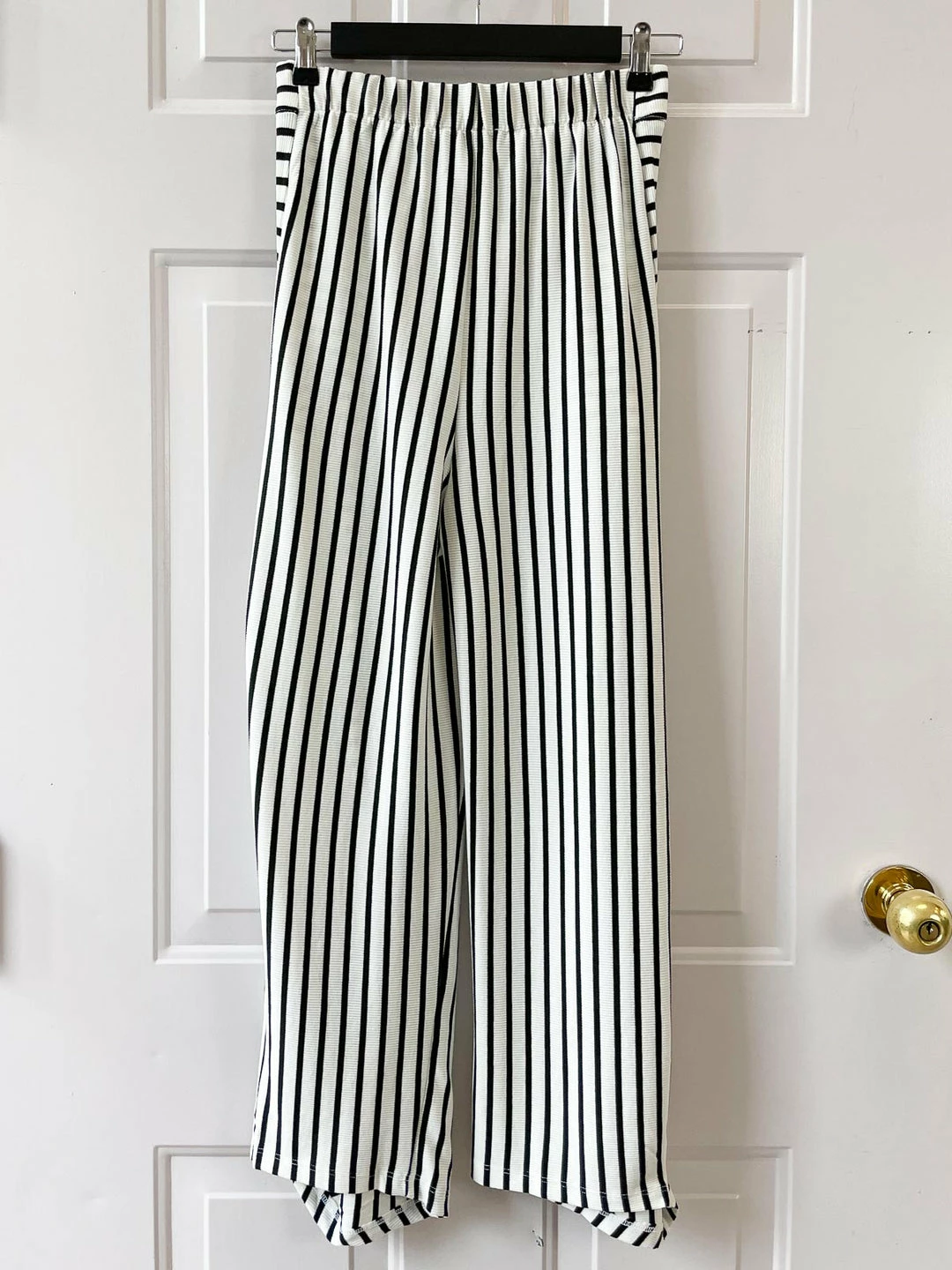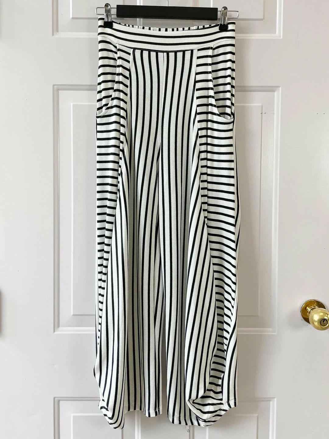 Kozan’s Jade Pant is a beloved style with a ballooned leg silhouette. Seam detail at legs create a full bottom while the horizontal and vertical stripes compliment for a flattering look. The pull on waistband has stretch elastic at back, with pockets at side seams. Kozan’s Lanes fabric is a ribbed knit in creamy white with black stripes.