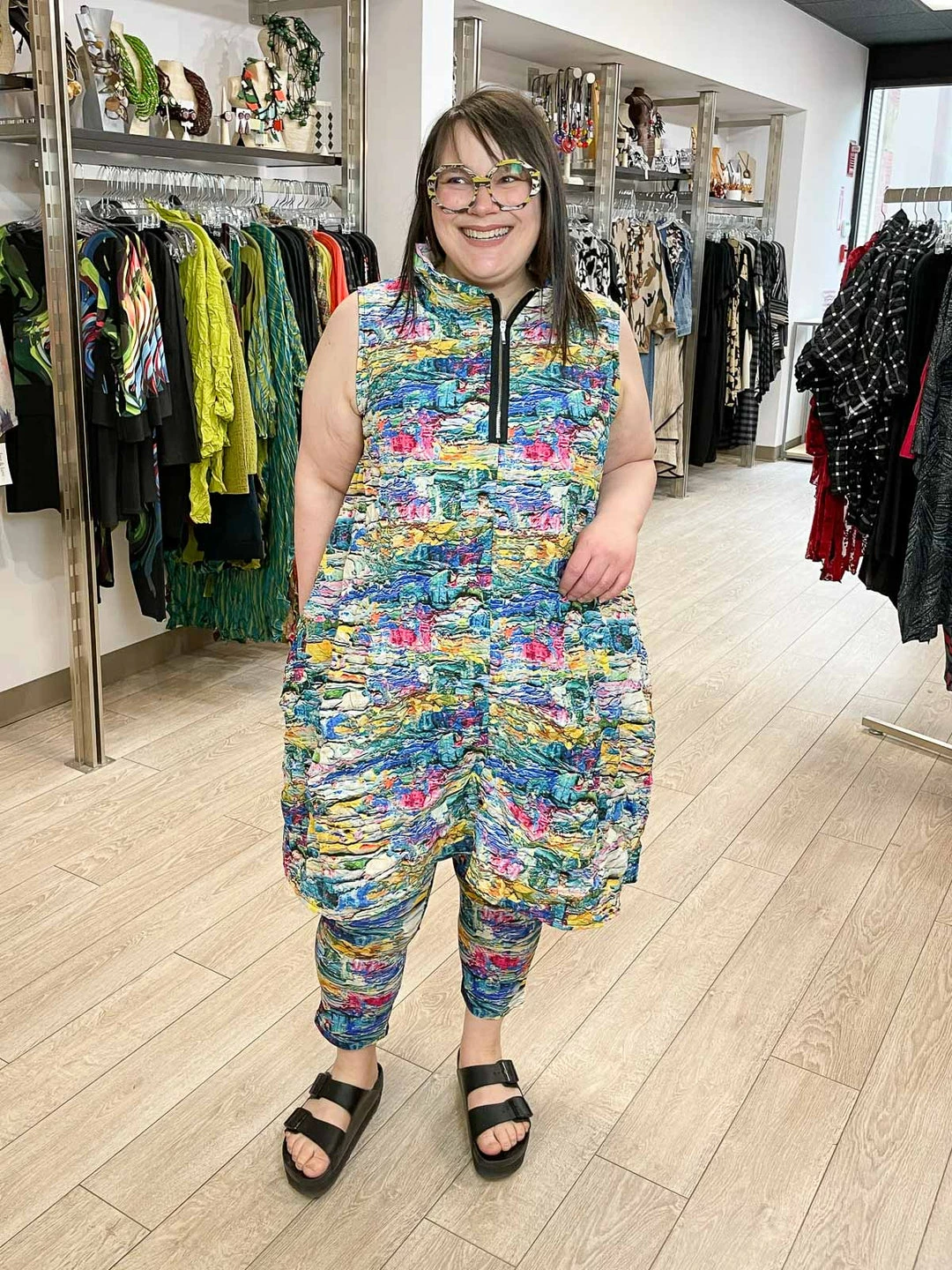 The sleeveless Aubrey Dress from Kozan is a jumper style vest perfect for layering. With a full a-line body, the hemline features darting at center that creates a ballooned silhouette. Half zip at mock neckline and side seam pockets complete the details. In a crinkle crepe de chine, the Money print is an artful multi-color pattern.