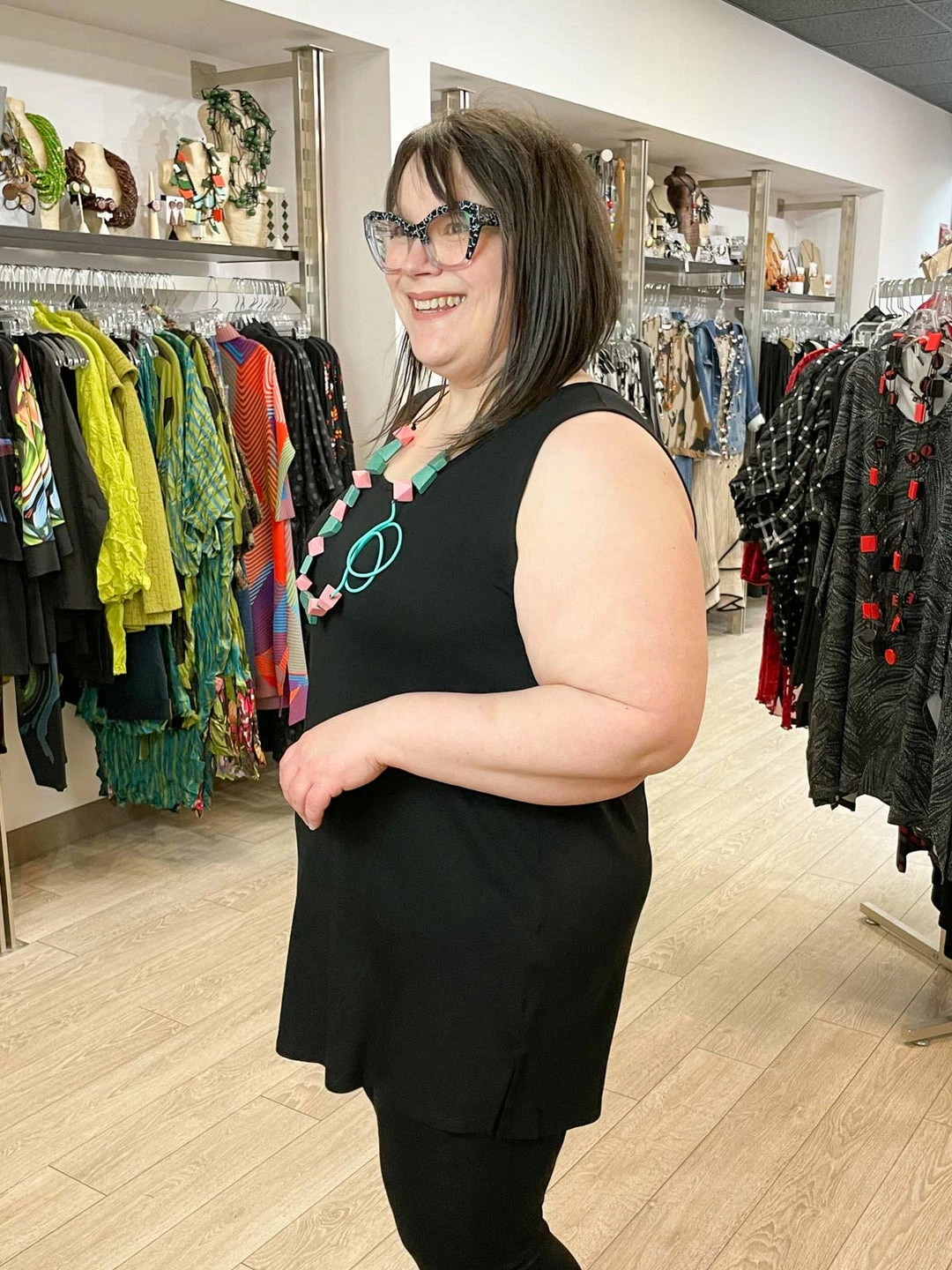 Karen (size 18 top, 14 bottom, 5’4″) wears size 1X.