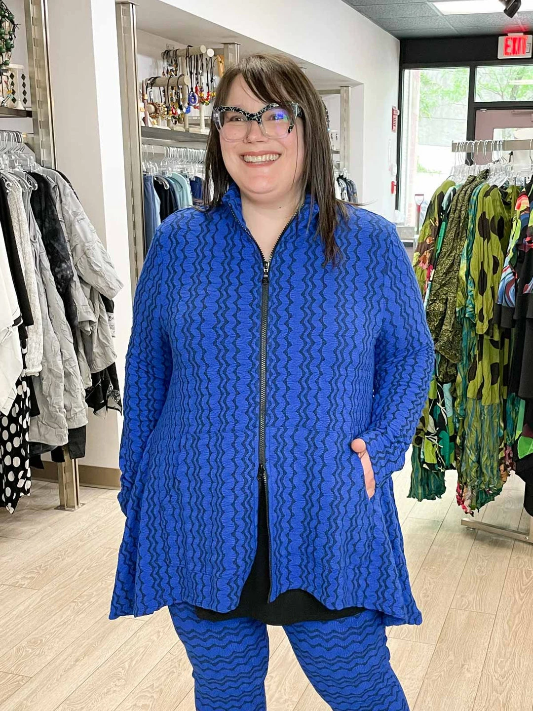 The Jane Jacket from Kozan is zip front style with a high low hemline and mock neck. The easy body has an a-line flare with pockets at front and long set-in sleeves. The Neptune fabric is a royal blue and black jacquard knit, perfect any season!