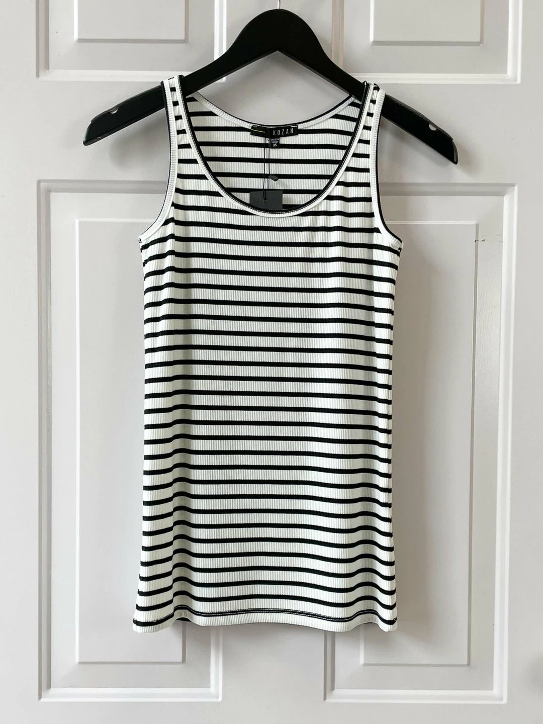 The Jill Tank from Kozan is the perfect layering style, with a slimmer longer length body. It has a round scoop neckline with thinner tank straps and an even hemline. Layer under Kozan’s toppers for a statement look. Kozan’s Lanes fabric is a ribbed knit in creamy white with black stripes.