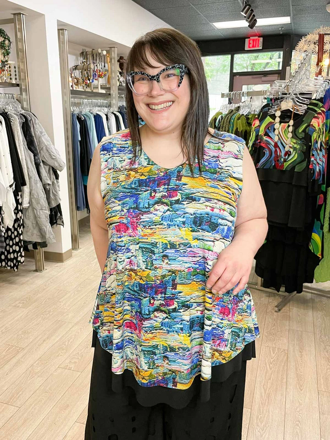 This flattering layered style features an attached printed overlay atop a slightly longer solid black layer. Full sleeveless a-line fit with curved hemline, v-neckline and raw hem detail.