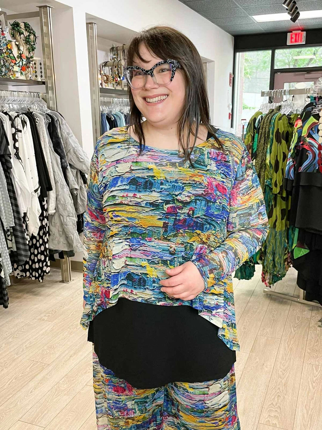 Kozan’s Mila Topper is a versatile pop over style in solid mesh with a dramatic curved hemline that points at sides, a high round neckline and three quarter sleeves. It’s sure to extend your wardrobe, giving you new looks over both longer length sleeves or sleeveless tanks and tunics and dresses. Even layer it under jumpers to just add a sleeve!