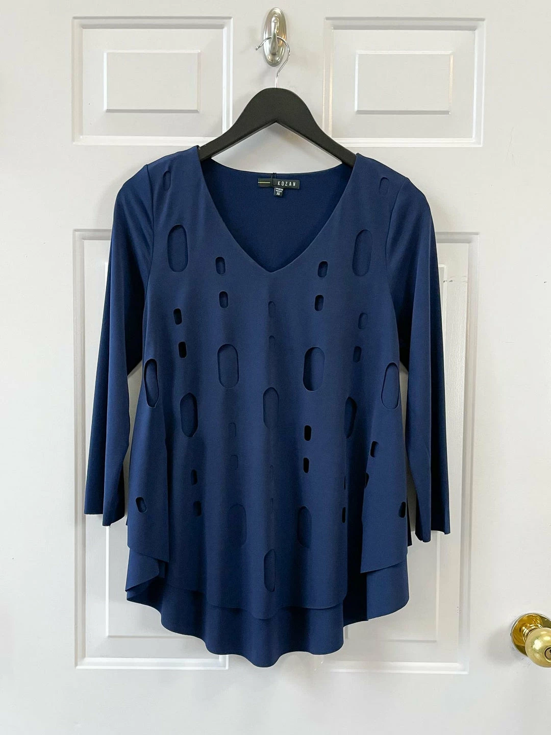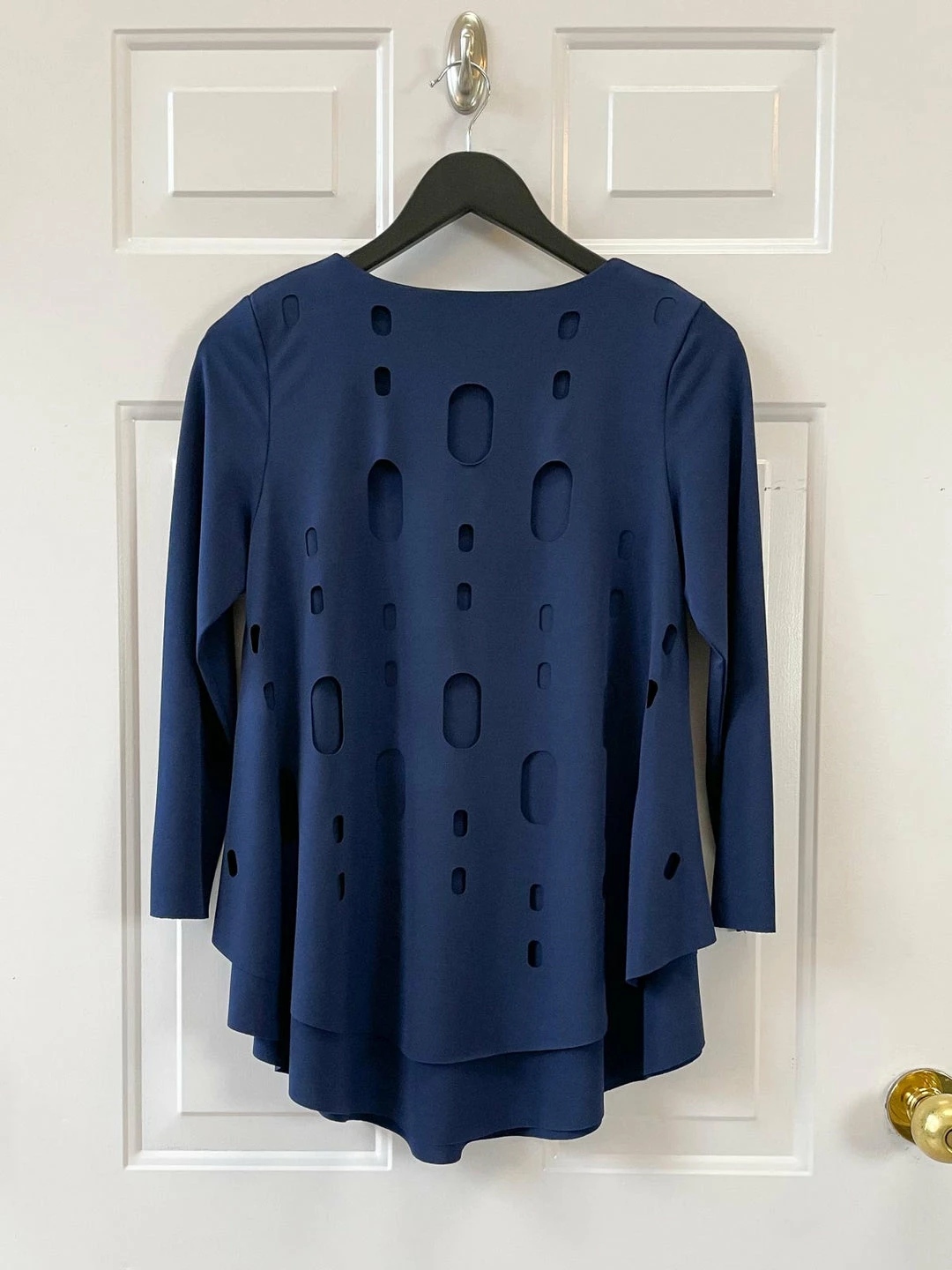 This flattering layered style features an attached overlay with laser cut-out detail atop a slightly longer layer. Full a-line fit with curved hemline, v-neckline and three quarter sleeves. Raw hem detail.