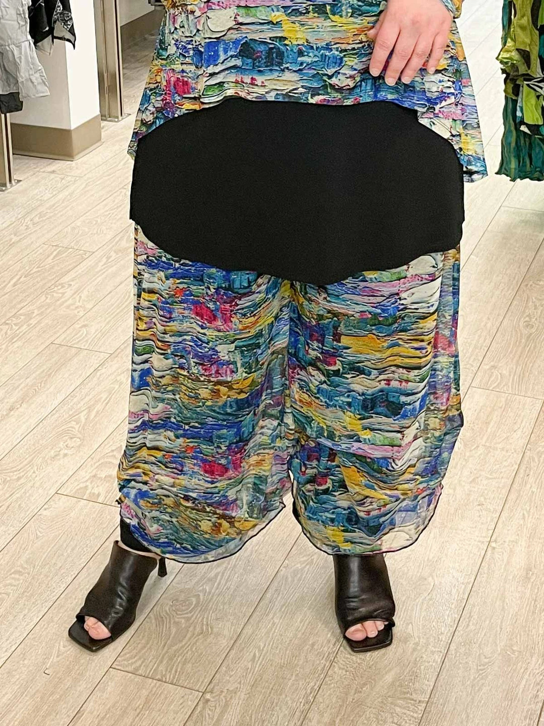 Kozan’s Meadow Pant is a chic style that has a full layered silhouette. A printed mesh overlay atop a solid black lining of stretch jersey knit features pintuck gather details at bottom. Pull on banded waist has a flat front with elasticized back.