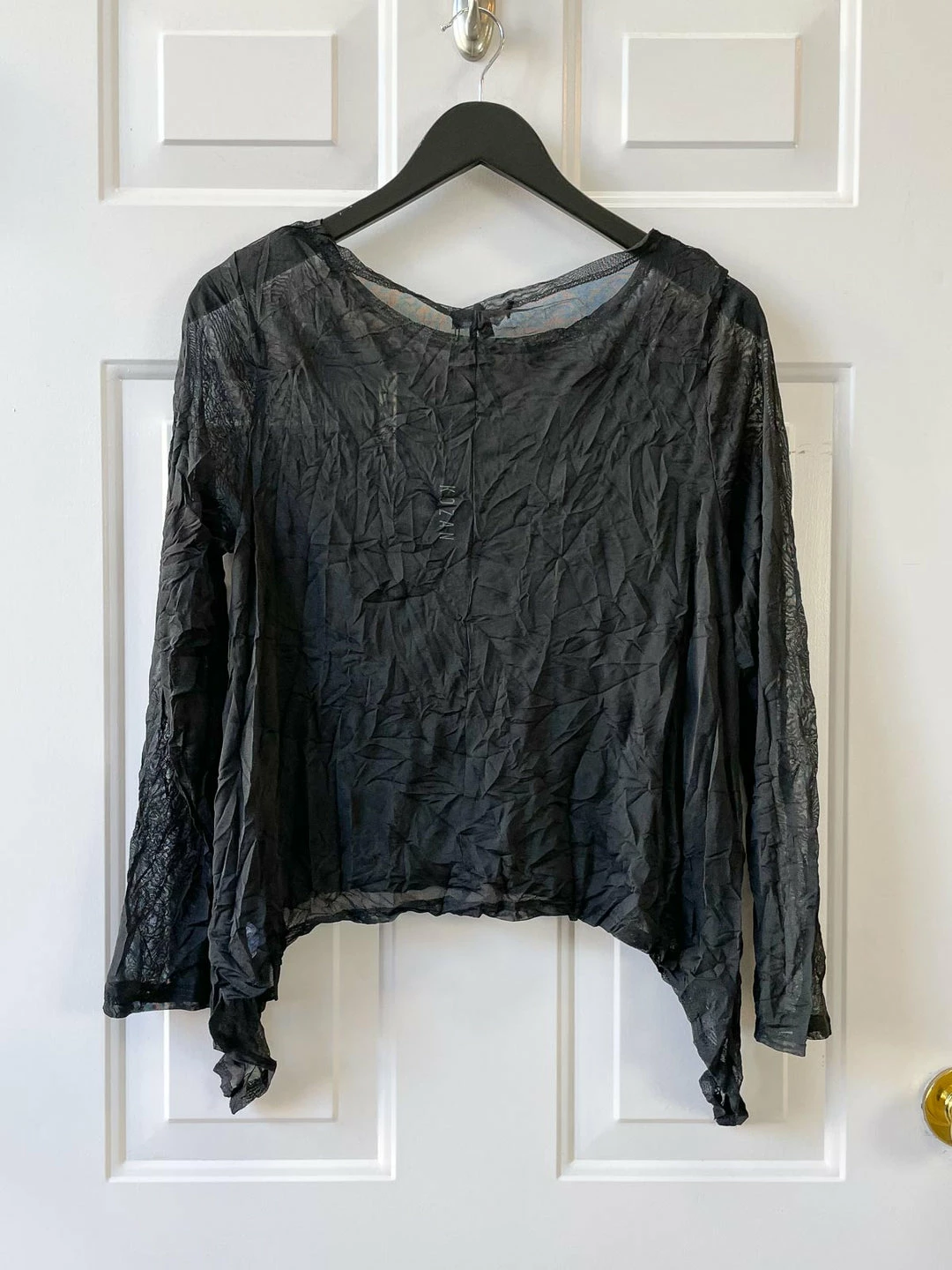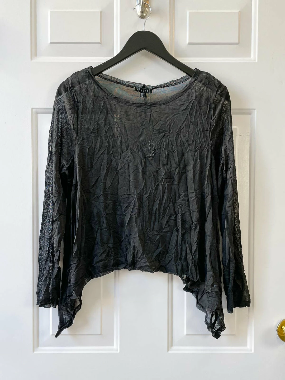 Kozan’s Mila Topper is an pop over style in crinkle mesh with a dramatic curved hemline that points at sides, a high round neckline and three quarter sleeves. It’s sure to extend your wardrobe, giving you new looks over both longer length sleeves or sleeveless tanks and tunics and dresses.
