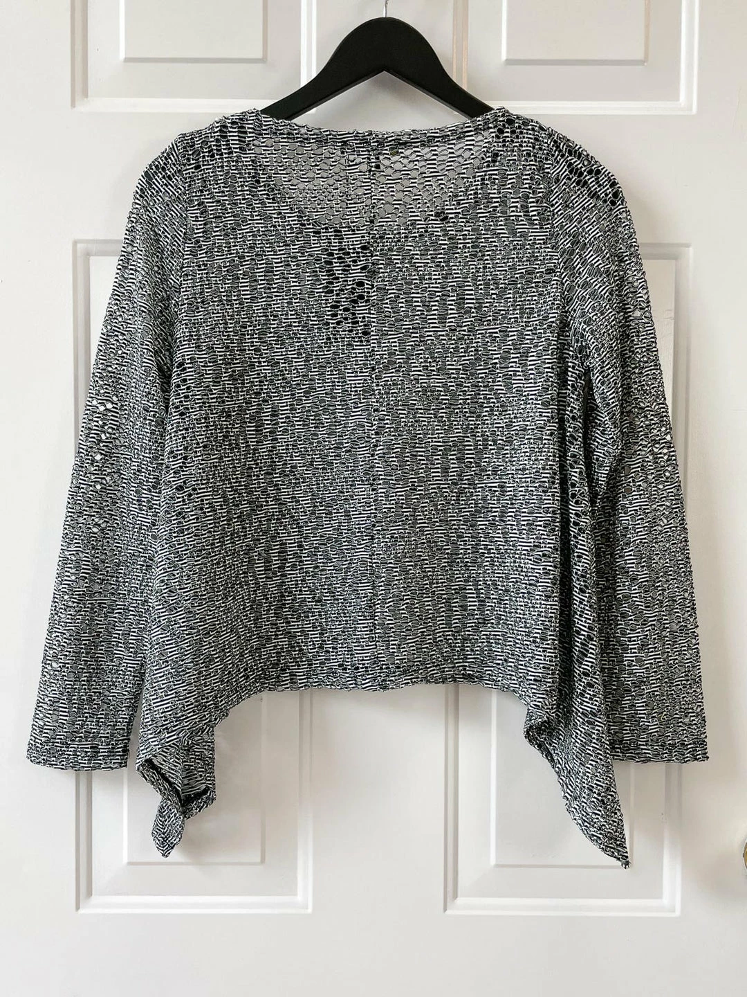 Kozan’s Mila Topper is a pop over style with a dramatic curved hemline that points at sides, along with a high round neckline and three quarter sleeves. It’s sure to extend your wardrobe, giving you new looks over both longer length sleeves or sleeveless tanks, tunics and dresses. The Moonlight fabric stands out in a black white burnout style open knit.