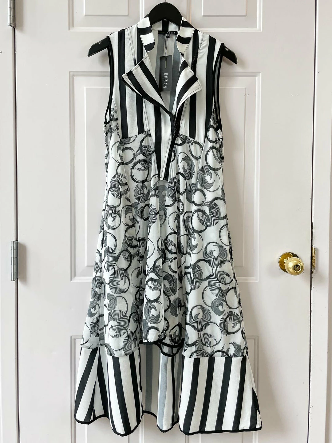 Kozan’s Myla Duster vest is a truly stand out style, with a longer length sleeveless body in a mix of printed mesh and striped crepe. The slim bodice has angled seaming along with an asymmetric zipper to waist. Worn closed the neckline has an open stand up collar, while worn half zipped it’ll show off notched lapels. The front is open from the waist down with a paneled stepped hemline and side seam pockets. The back features unique seaming details, as well. This playful piece is sure to add a little art and a lot of edge to your look! The Rings mix features black and white circle printed mesh with black and white striped lightweight crepe.