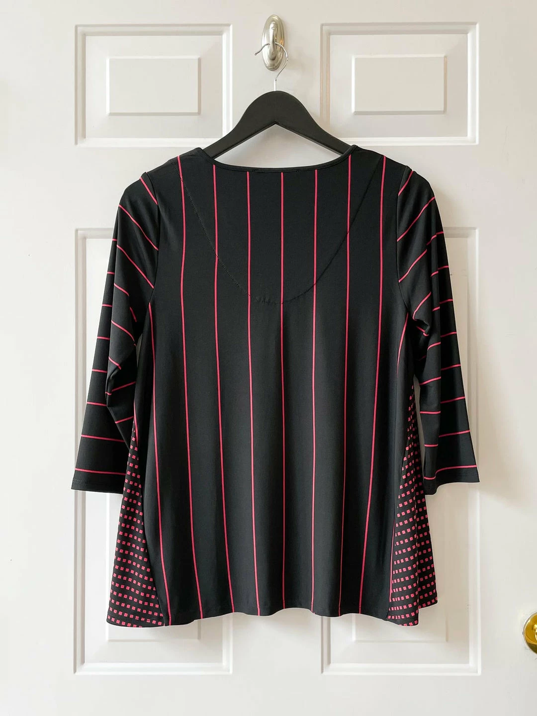 Part of Liv’s Geo Mix Jersey collection, the Maggie Tee is the perfect a-line shape with a flows over the body. Flattering side insets are done in contrast print. A soft v-neckline and three quarter sleeves complete the details.