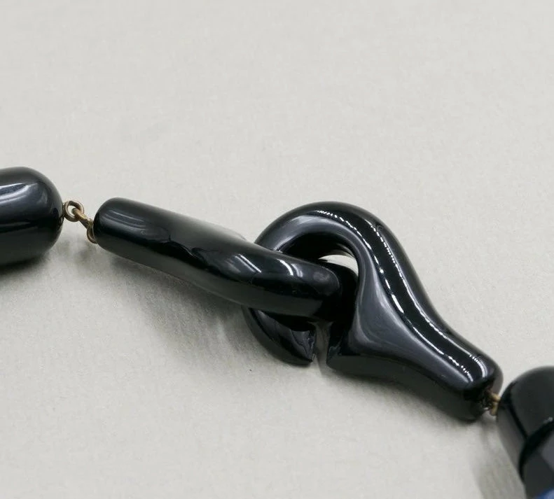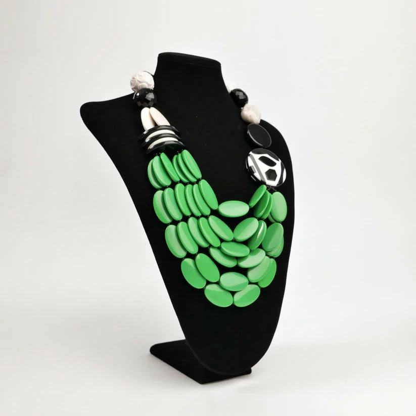 The asymmetric Viridian Necklace from Michaela Malin features classic black and white with a bold accent of green. The mixed resin beads features solid and patterned accents creating a unique and versatile piece. Locking clasp closure at back.