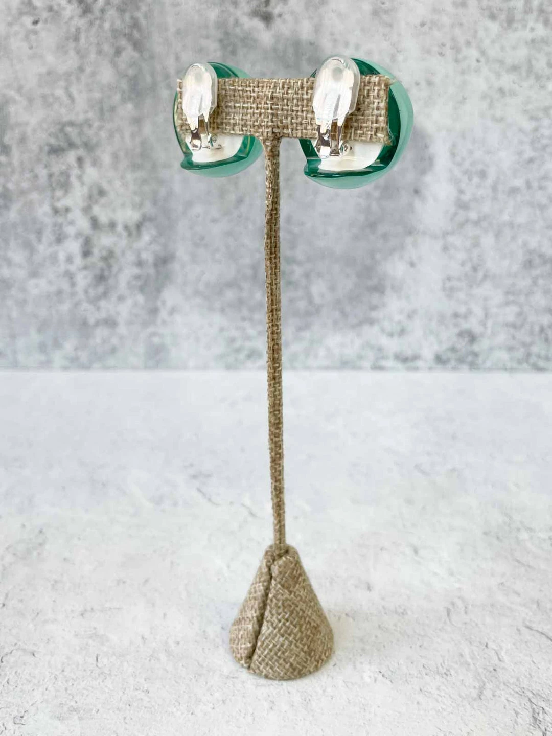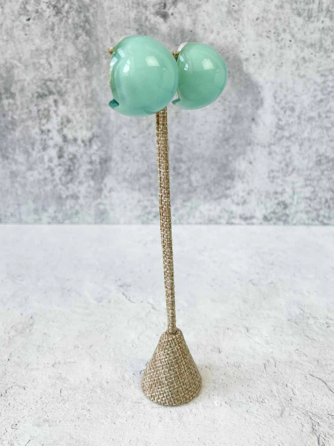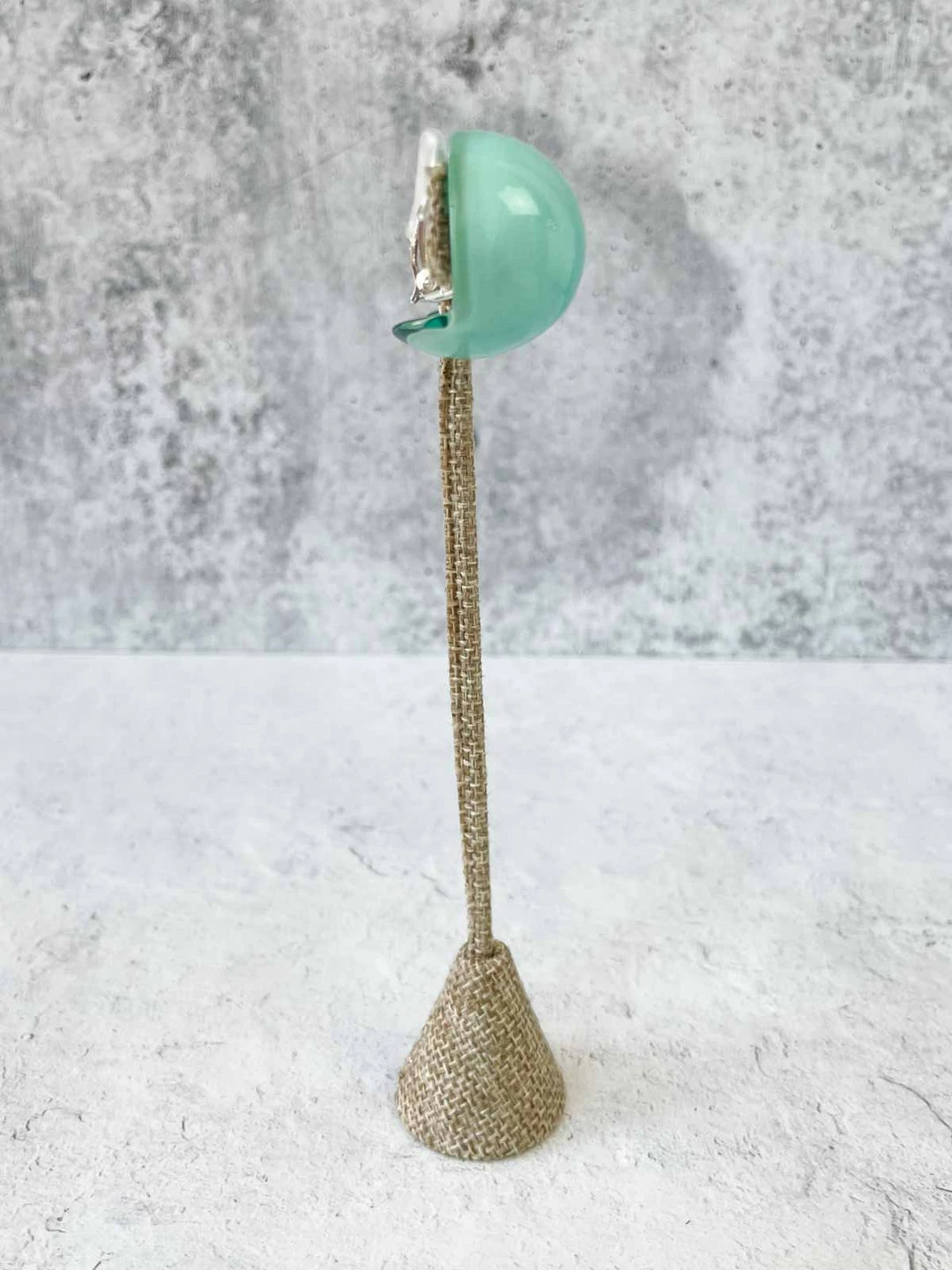 These smaller clip on earrings, still pack a lot of style, with high shine acrylic domes in a beautiful soft aqua blue-green hue.