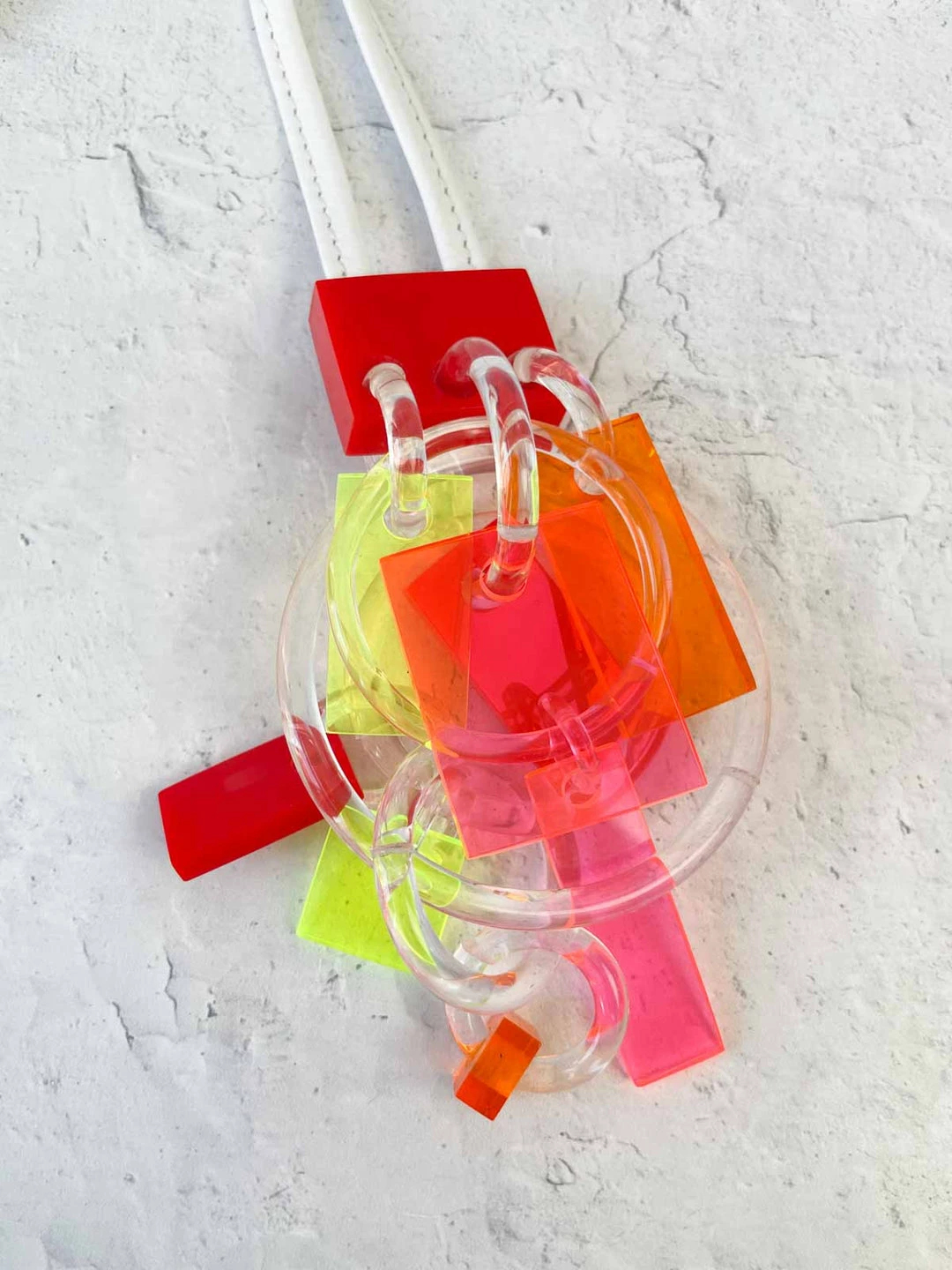 This pendant style features transparent neon drops on clear o-rings on a coordinating red opaque square. The matching leather cord is in a light metallic white-silver.