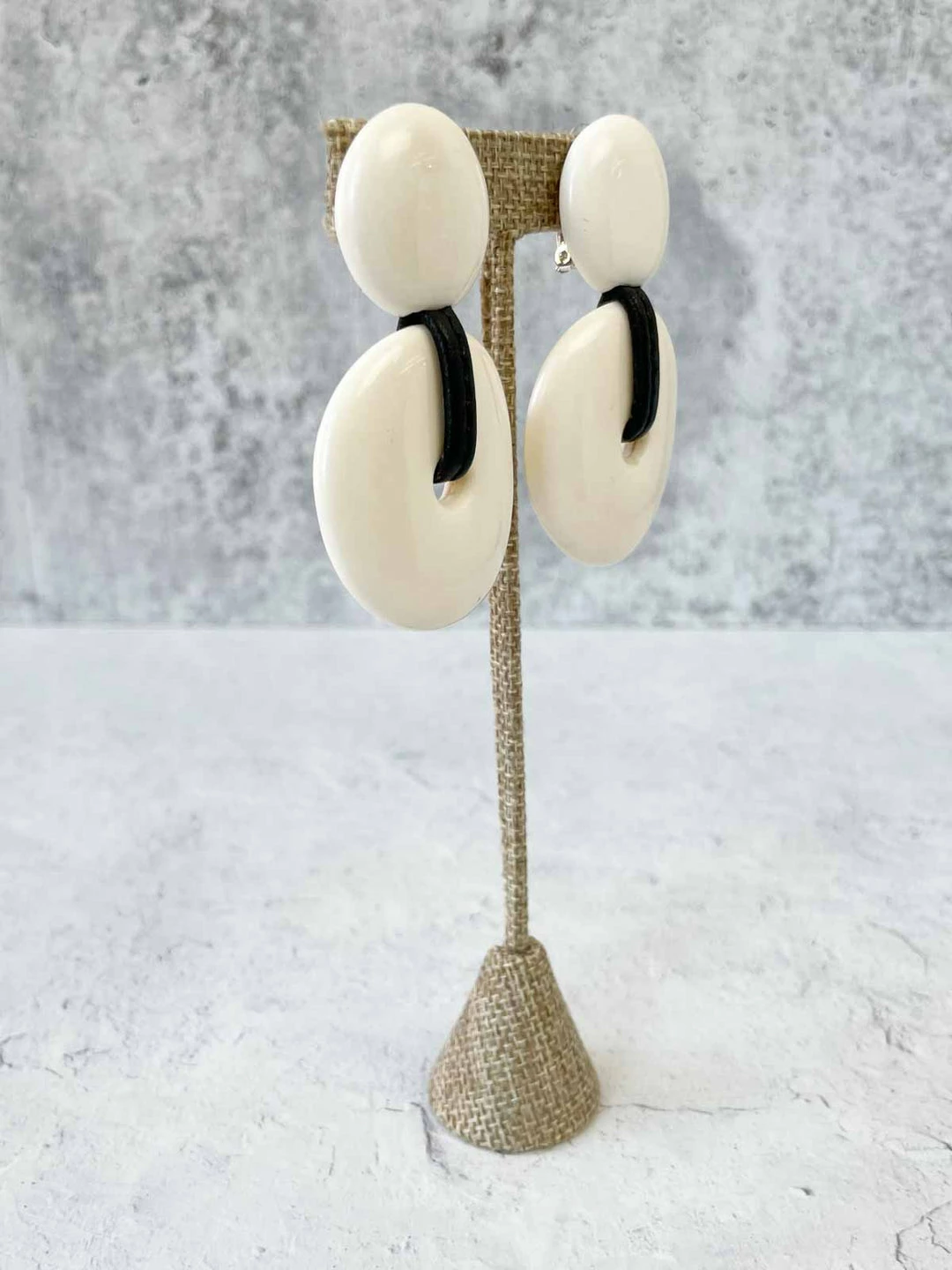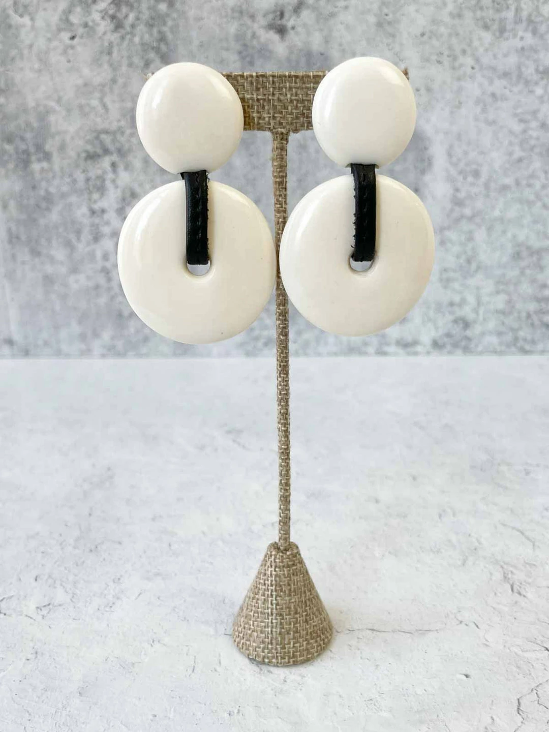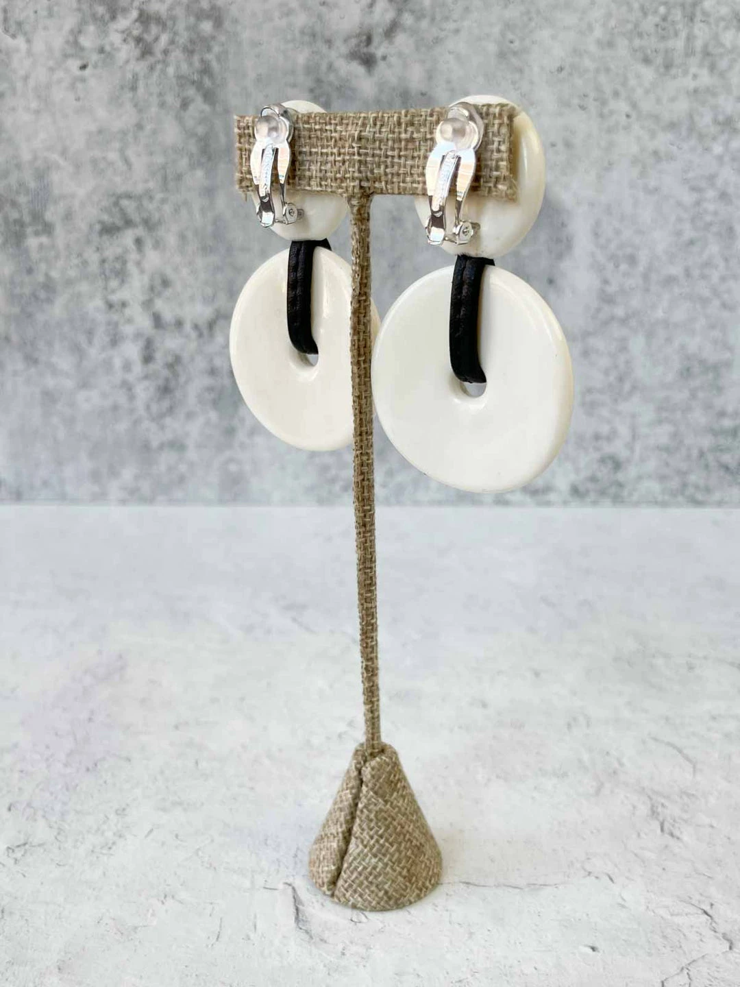 These classic ear clips from Monies feature a two piece circular design in polished bone, accented with a leather.