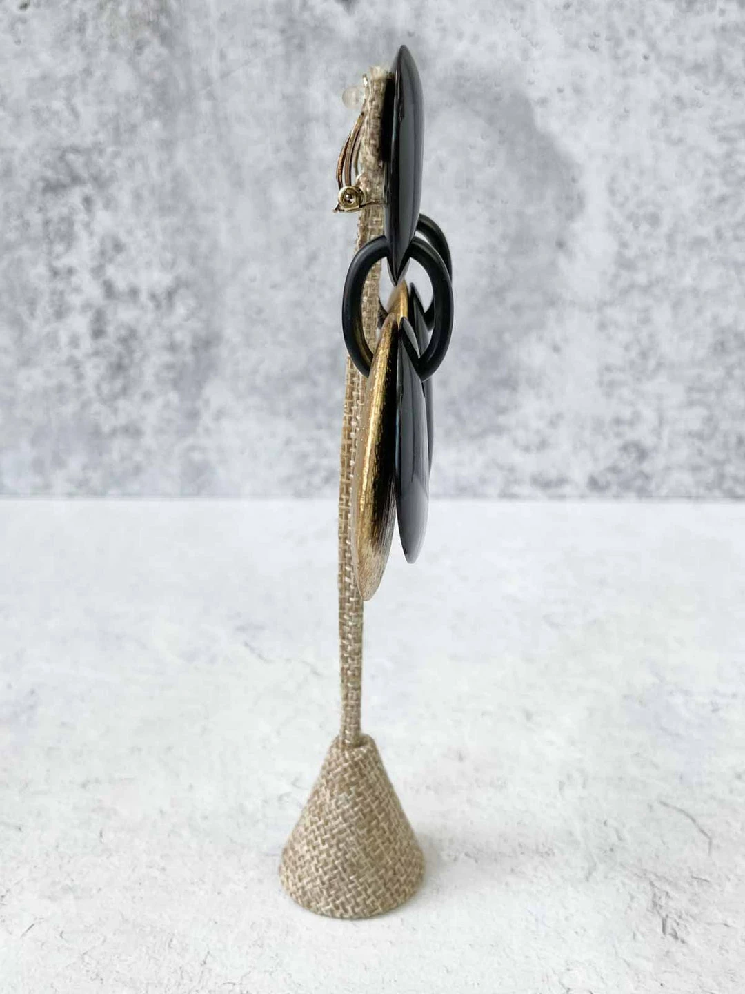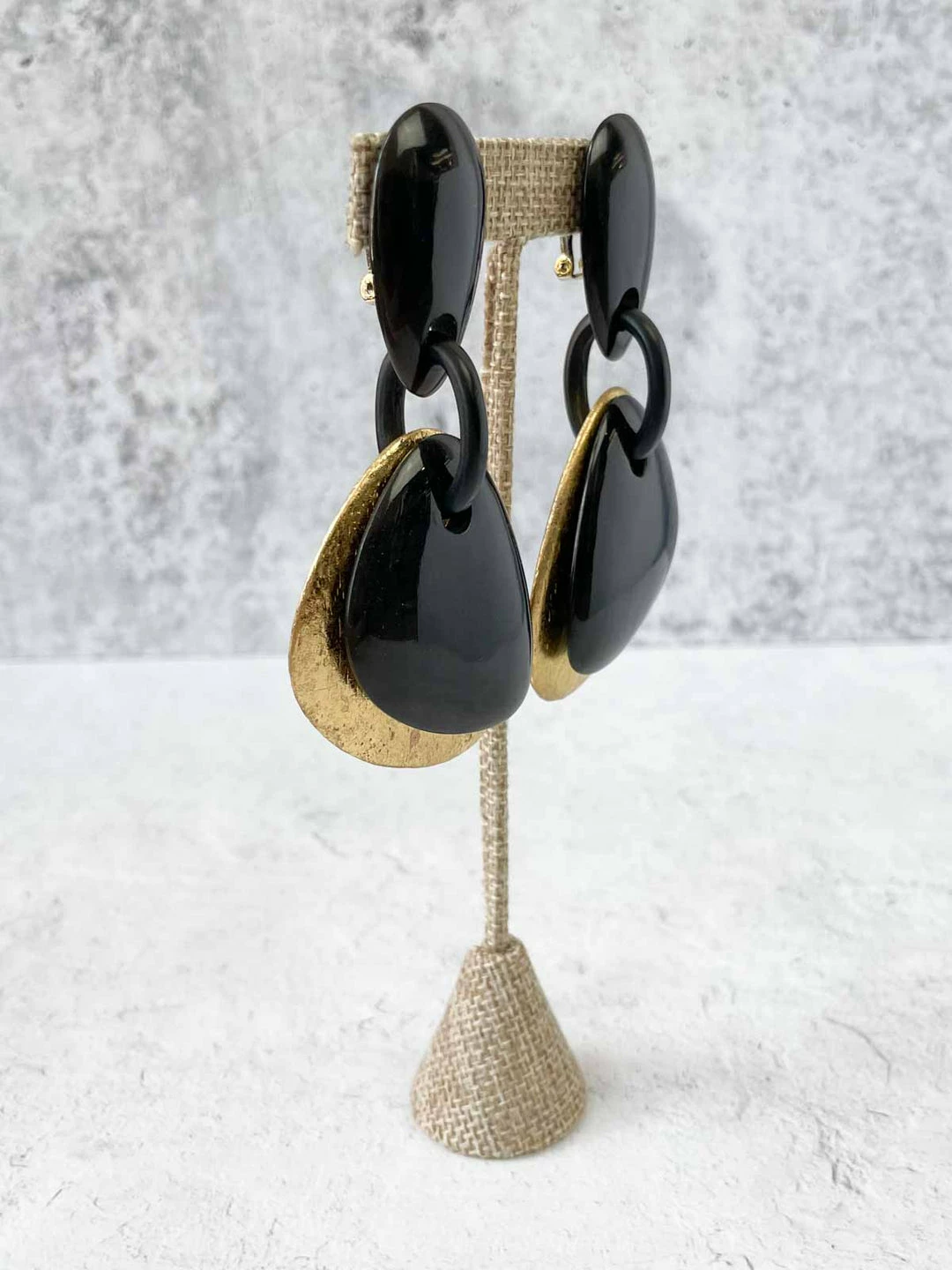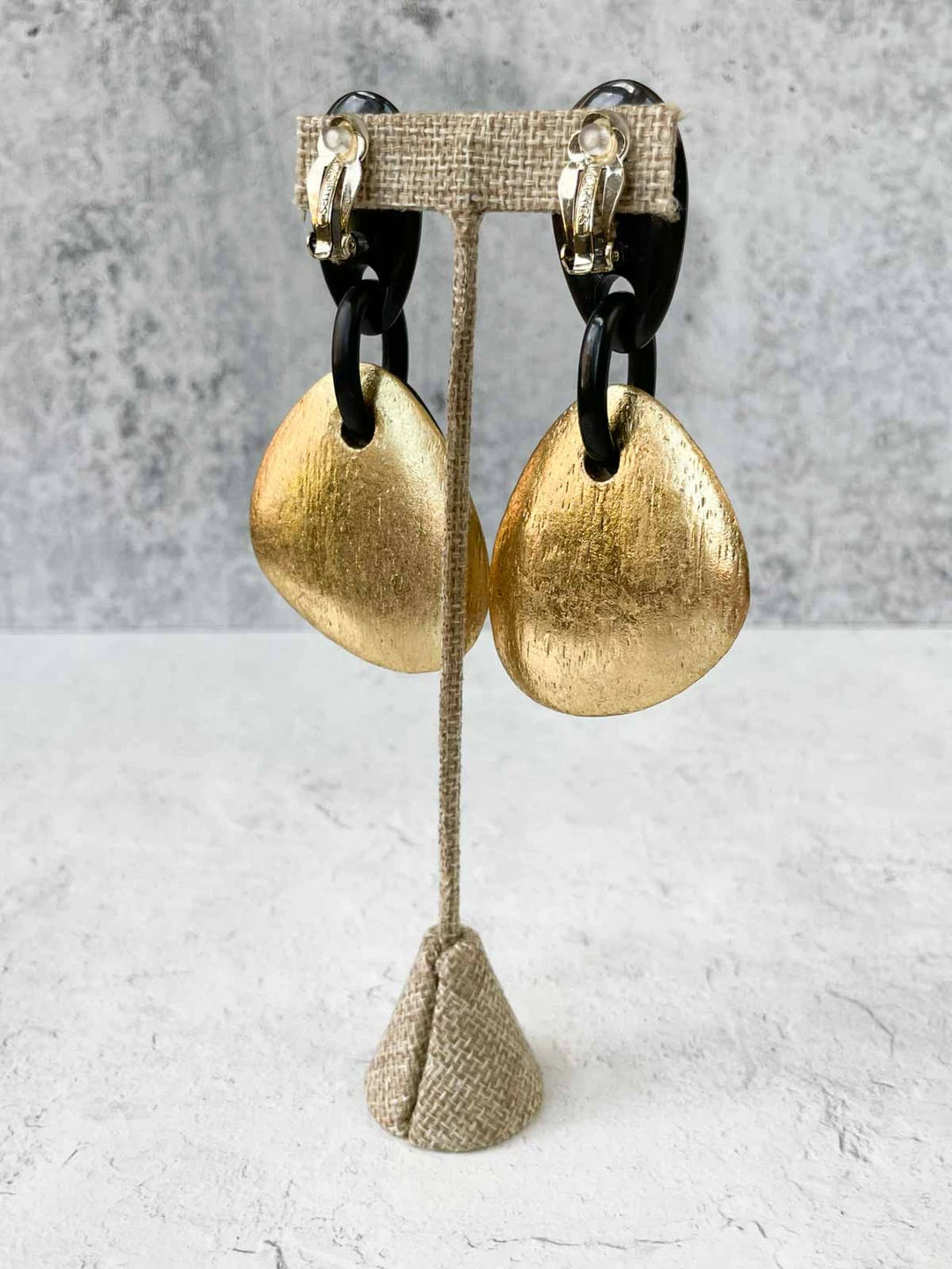 These beautiful ear clips have a layered drop design with a wooden gold foiled shape topped with a polished horn shape, hanging from coordinating horn.
