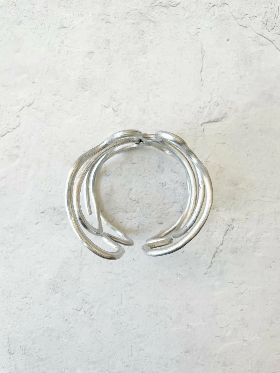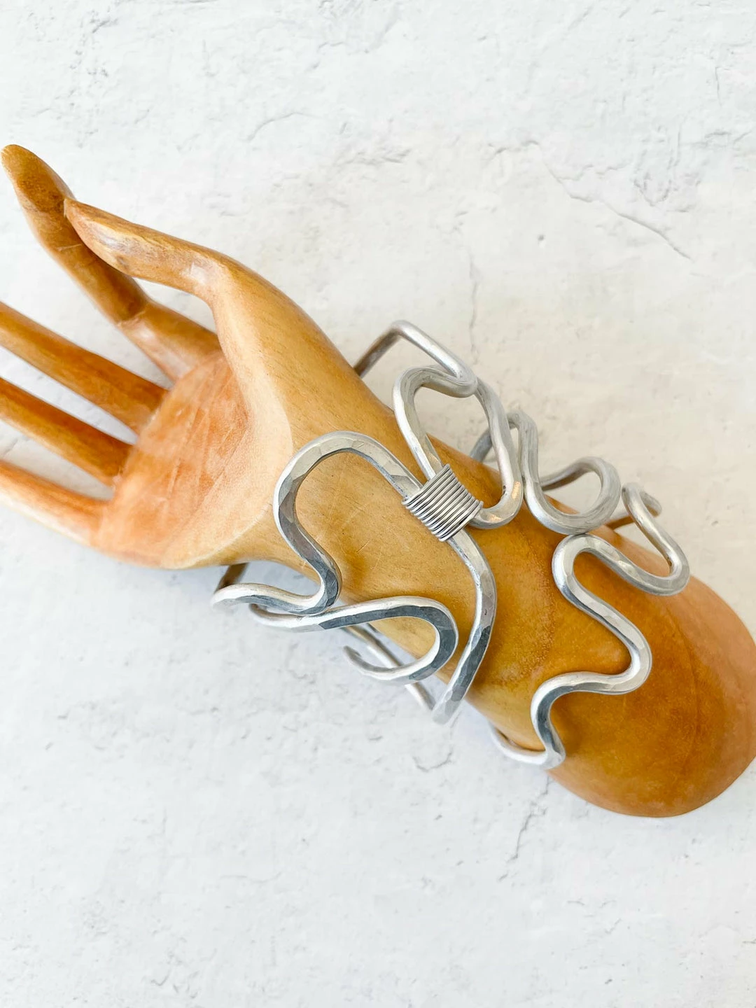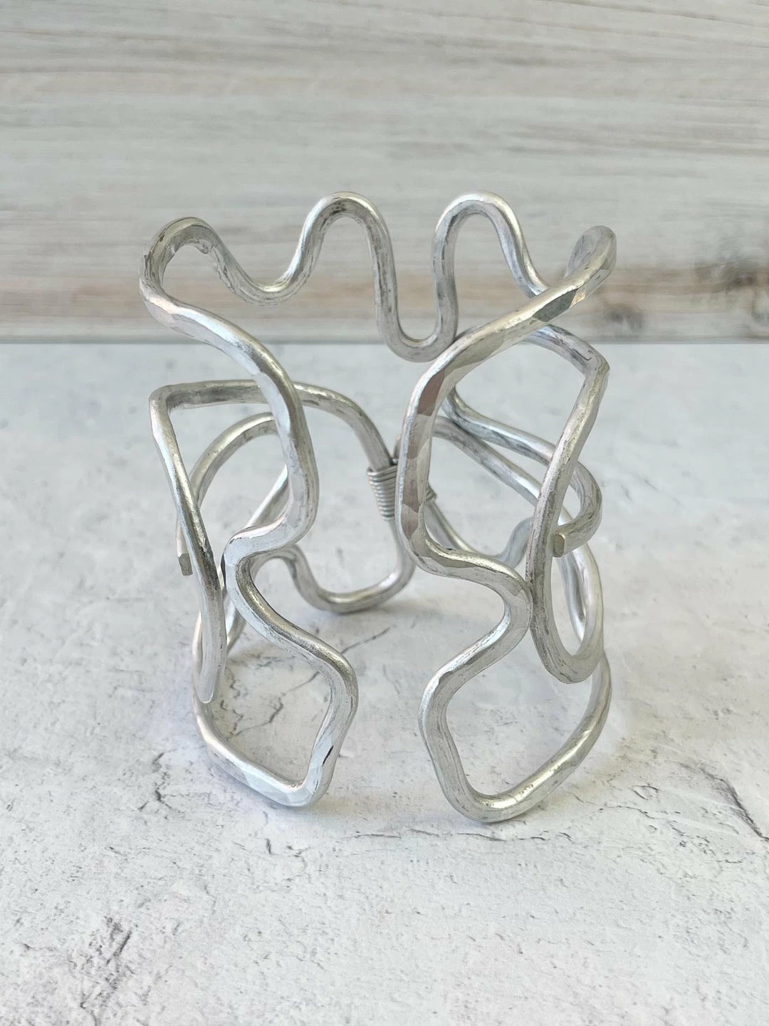 The Amaze statement cuff bracelet from OC is an extra wide design with open design hammered wire. This bold style has an opening at one side for easy on and off.