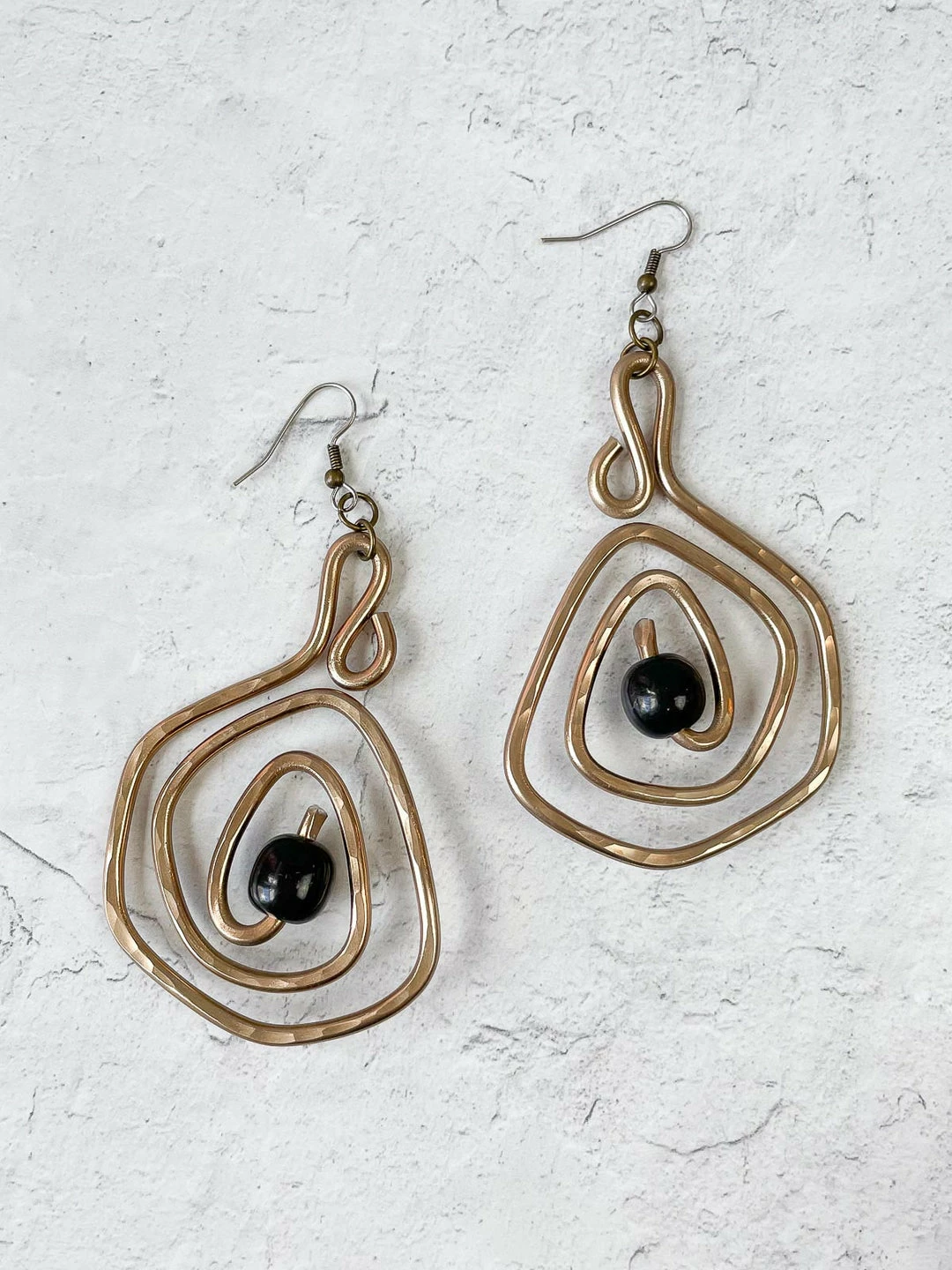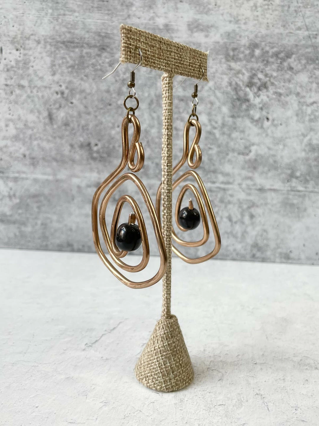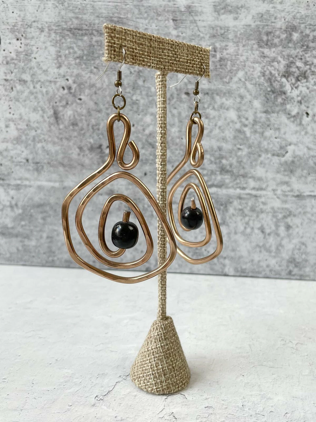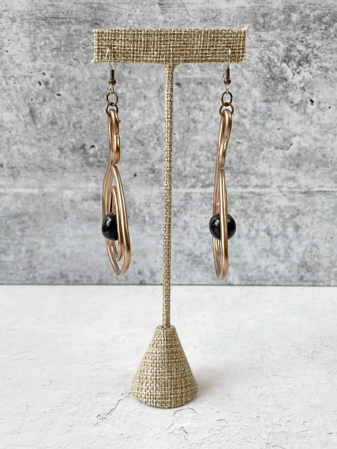 OC’s Laguna earrings are an extra large statement style that feature a flattened aluminum wire shape with black bead at center.