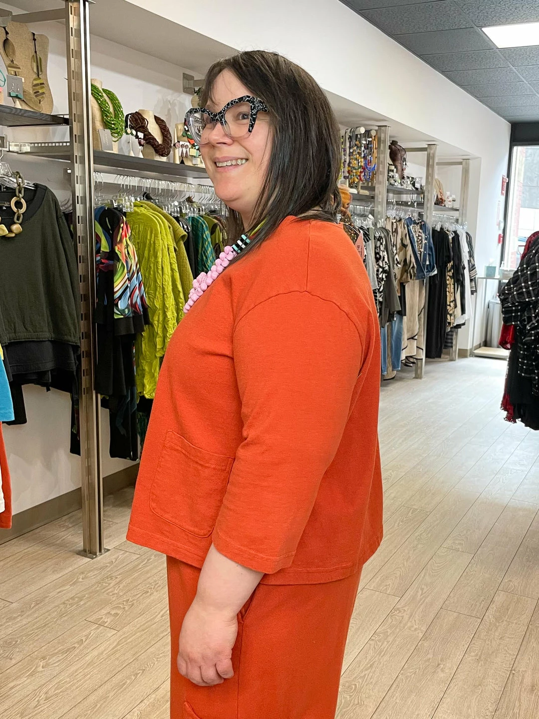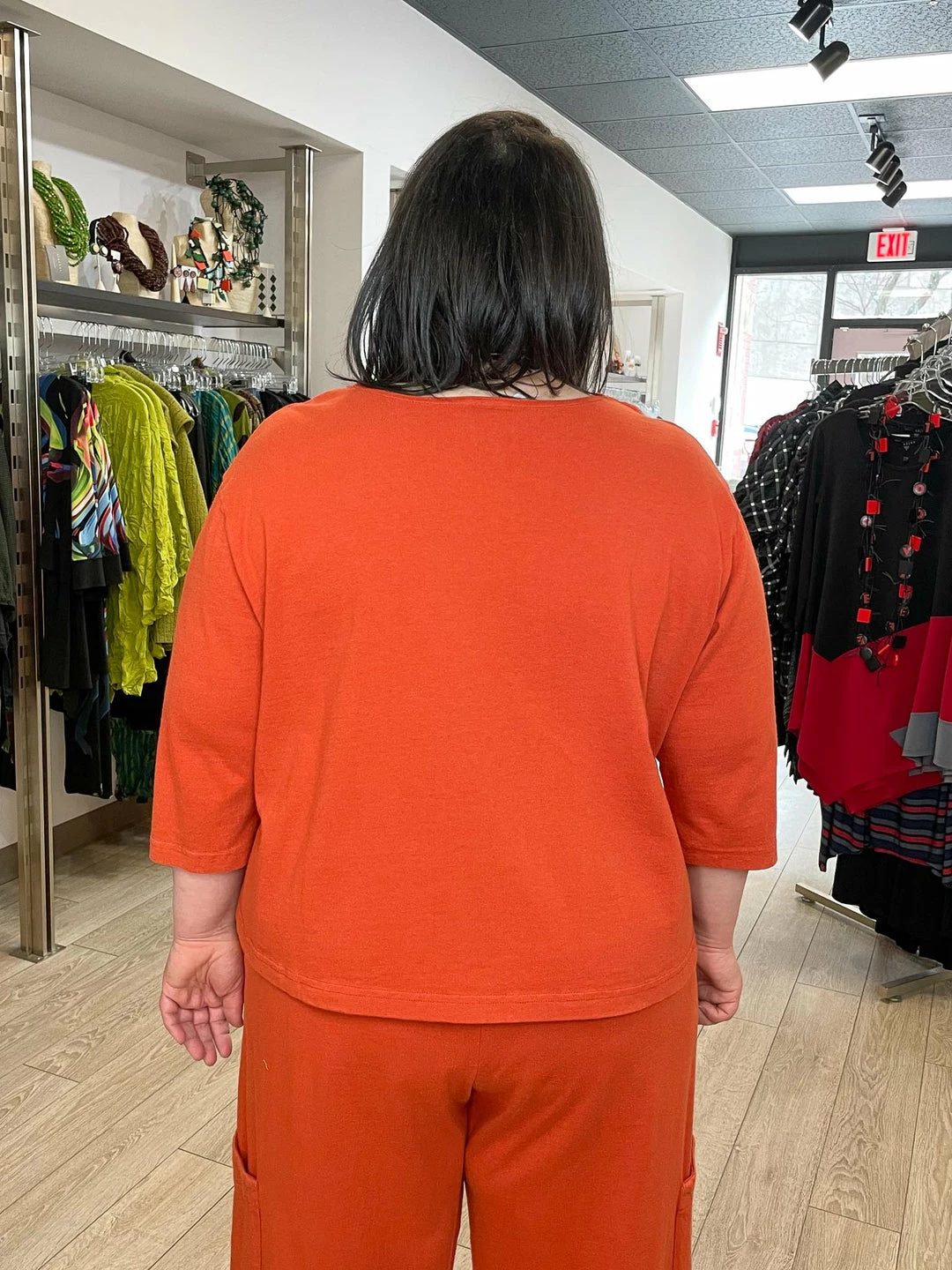 The perfect short top, this boxy style shows off two patch pockets at front, with a round neckline and three quarter sleeves that are slightly dropped.