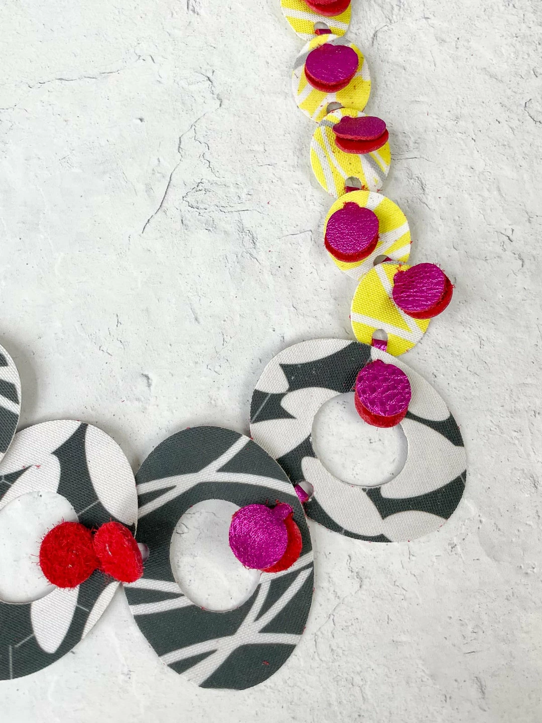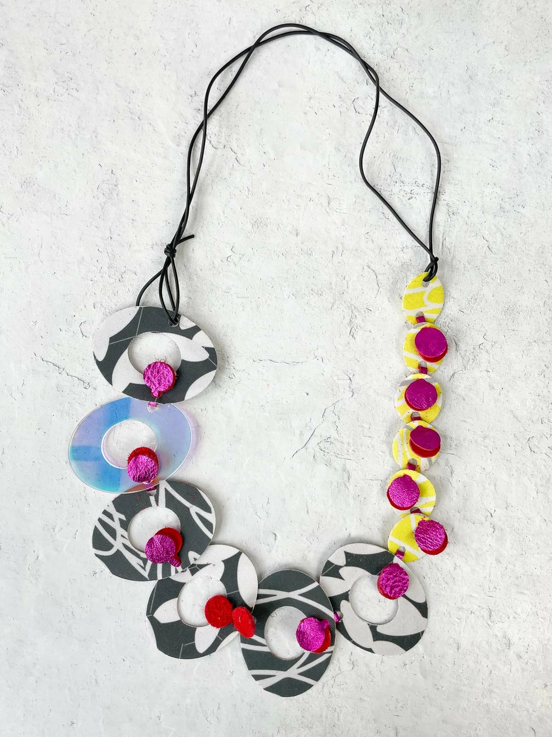 Artist Criselda Lopez creates unique wearable art using a range of upcycled materials. This long necklace features open cut-out die cut ovals and rounds in acrylic and textured fabric sheeting, all linked together with coordinating fabric or leather, hanging on knotted rubber cord.