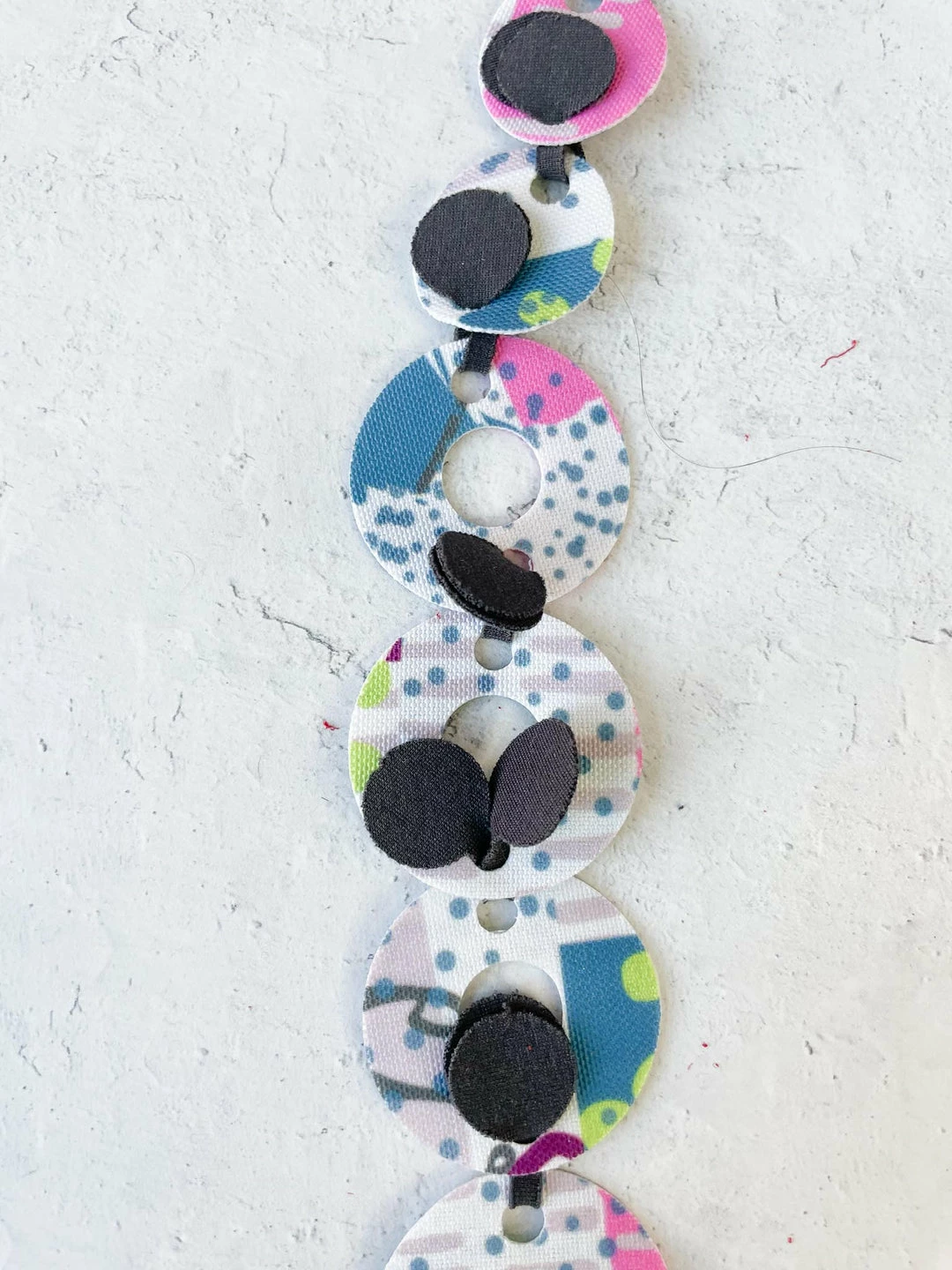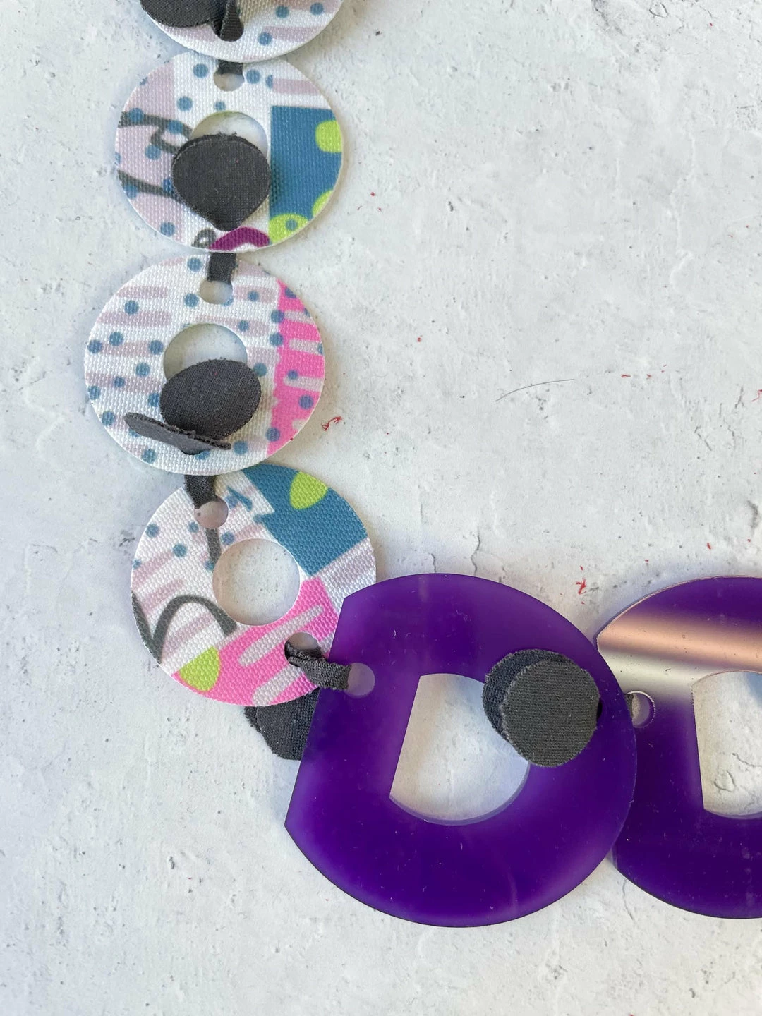 Artist Criselda Lopez creates unique wearable art using a range of upcycled materials. This long necklace features open cut-out die cut shapes in acrylic and textured fabric sheeting, all linked together with coordinating fabric or leather.
