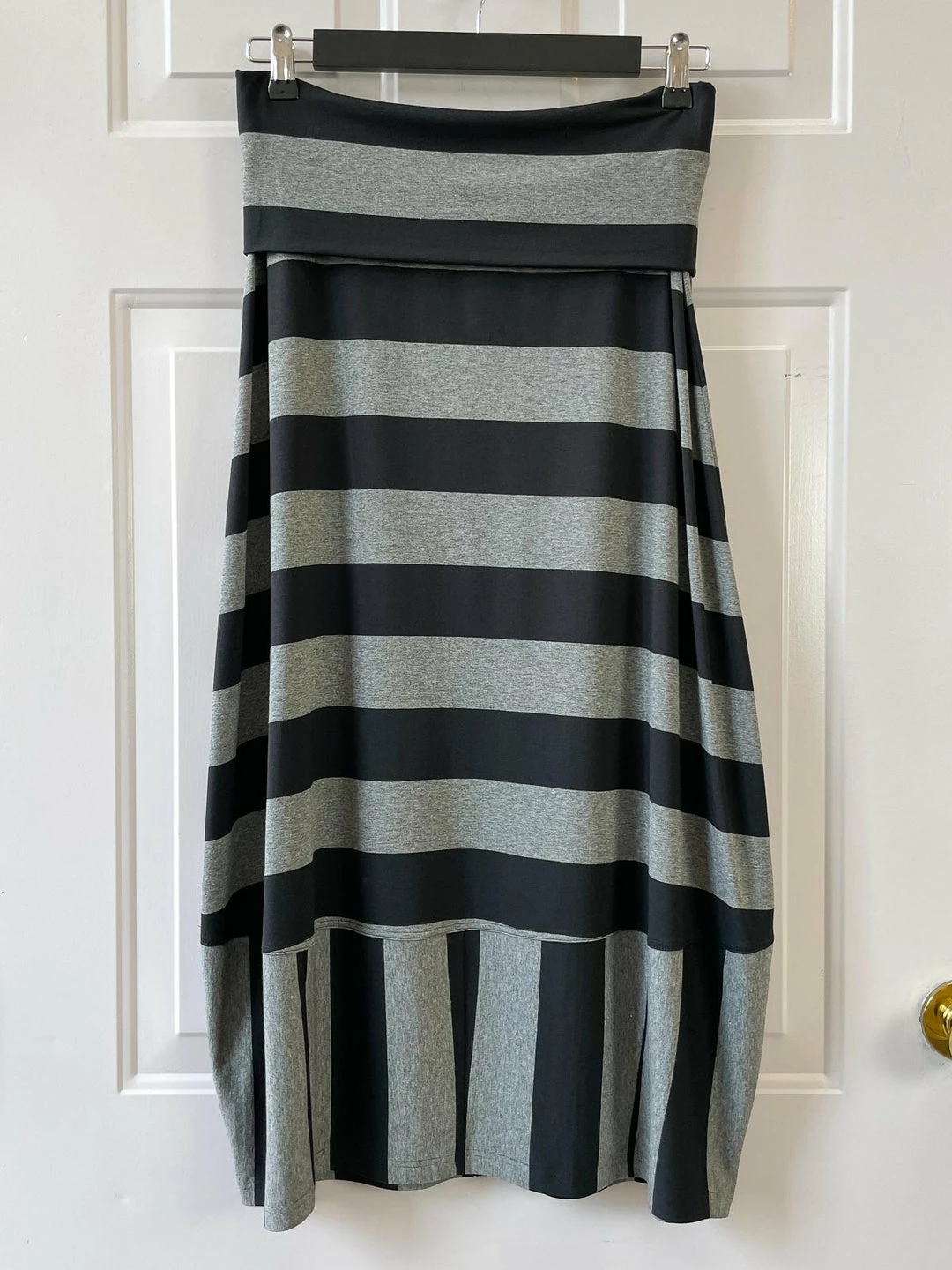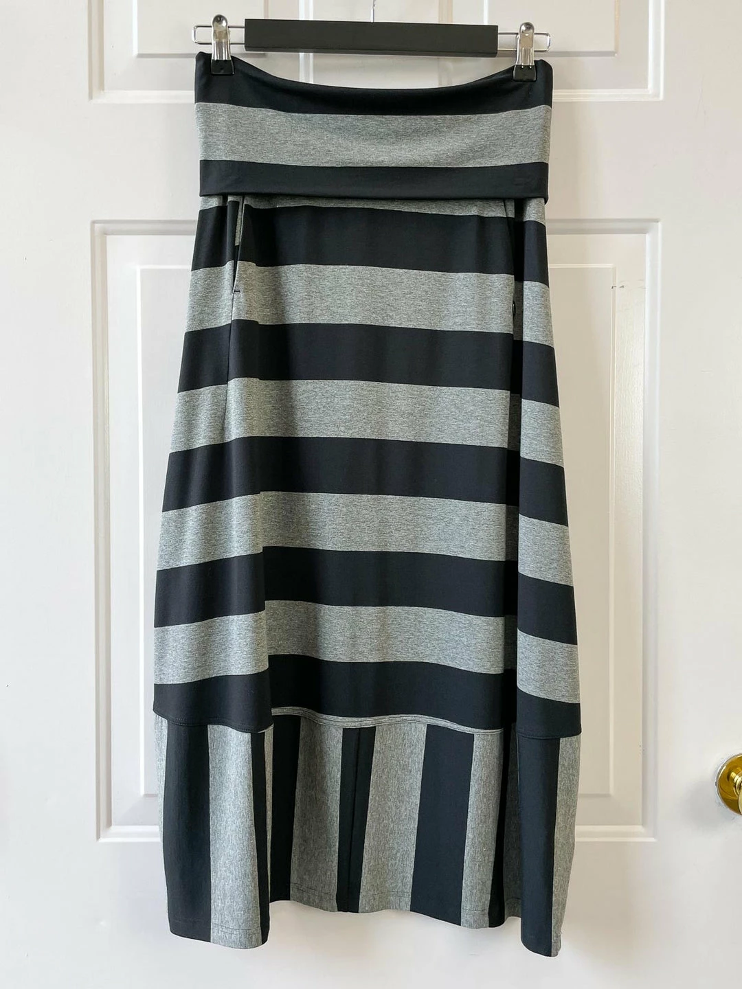 In wide stripes of black and heather grey, this midi skirt features a lantern shape paneled hemline. The fold over waist has slant pockets at side seams.