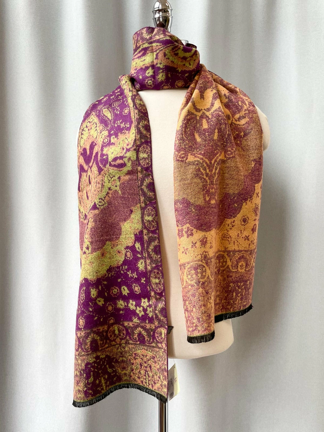 This long rectangular scarf shows off a reversible art pattern in soft brushed cashmere. Ends have 1/4″ black fringe. The perfect accessory for any fall or winter ensemble!