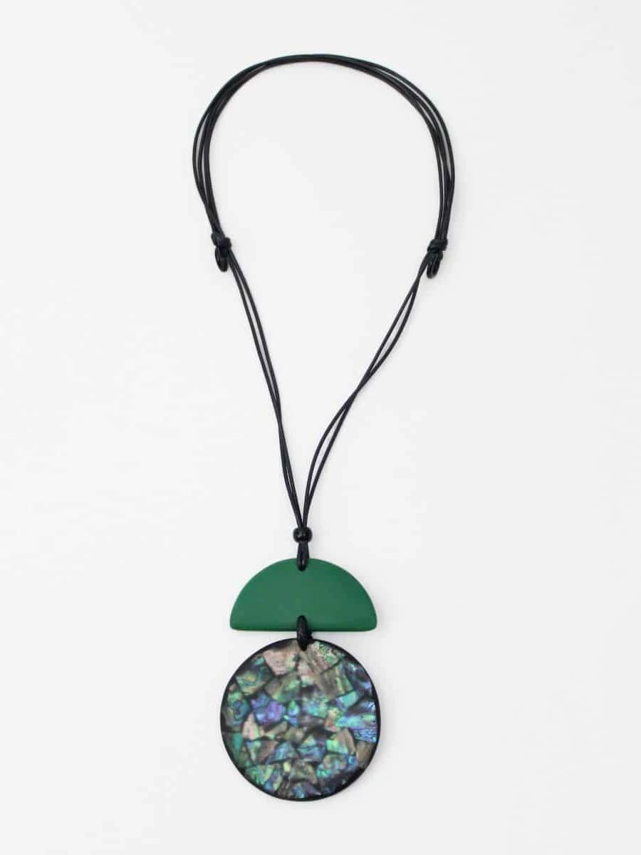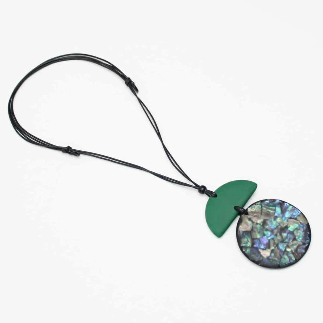 This beautiful pendant is like a piece of art. The large black resin pendant is decorated with a beautiful iridescent mosaic design in shades of green and accented with a green geometric bed up top. It might look heavy, but it is super lightweight and easy to wear. Hung from an adjustable black wax cord, this pendant will dress up that little black dress, or can simply wear with a tee and jeans.