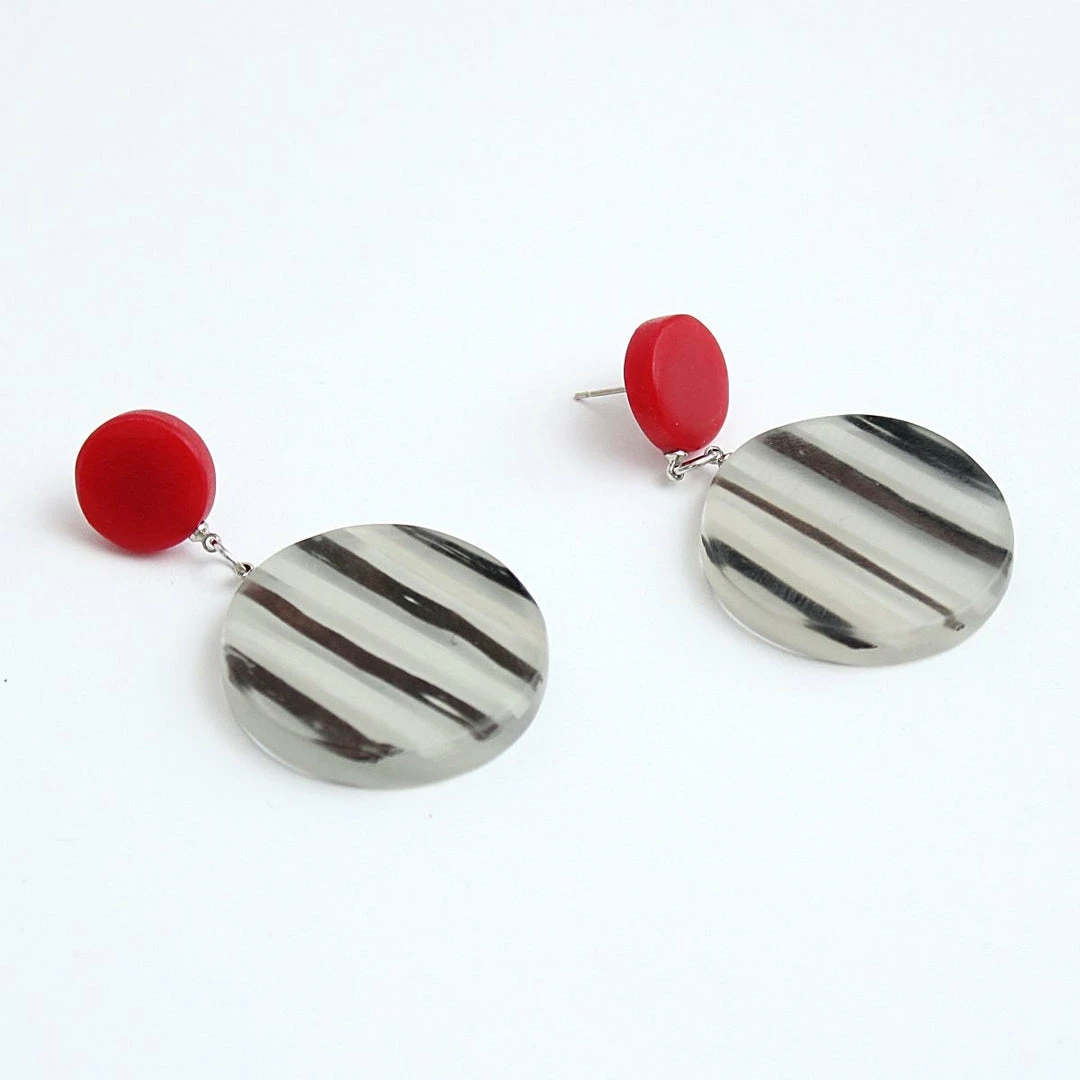 These chic earrings are handmade of translucent resin and hang in a round shape. Detailed with raffia stripes in coordinating colors that dangle from a black stud for added dimension. Very light but stunning, these beautiful earrings will make a statement with any outfit!