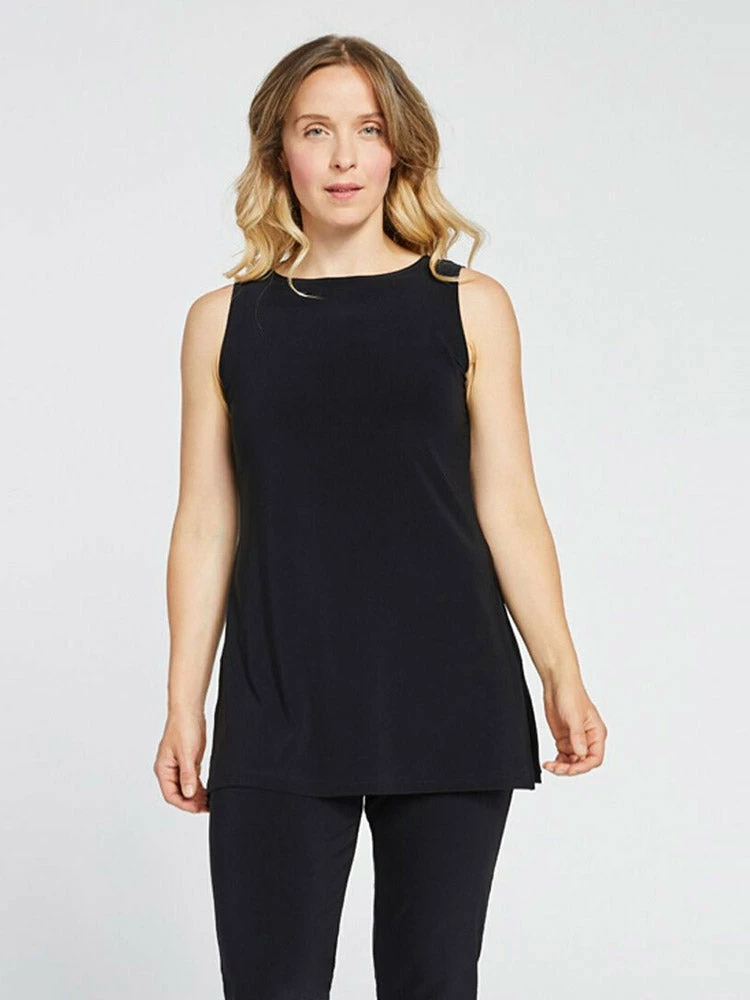 A Sympli essential, this sleeveless basic tunic has a straight shape with high neckline. Even hem with side slits.
