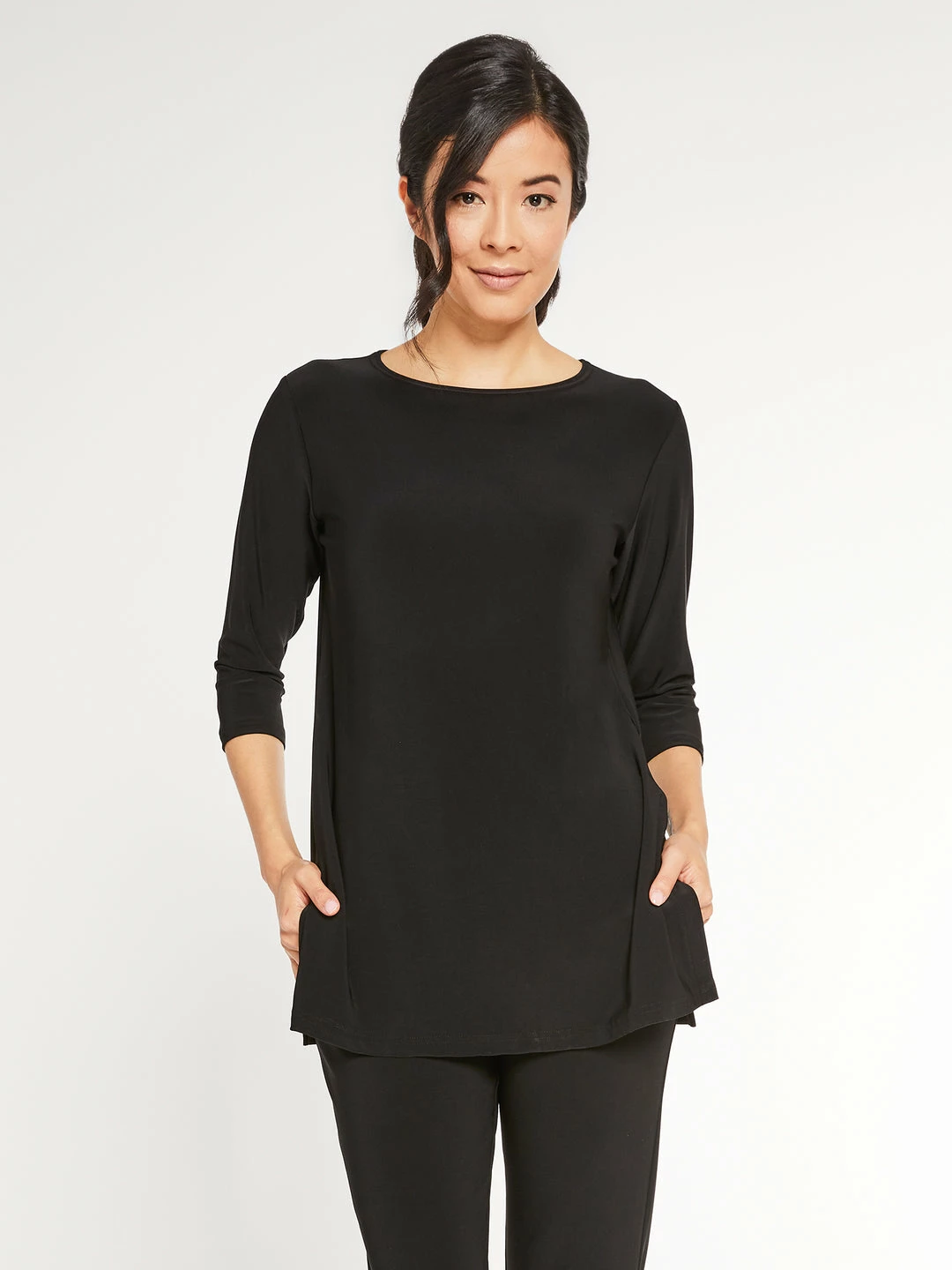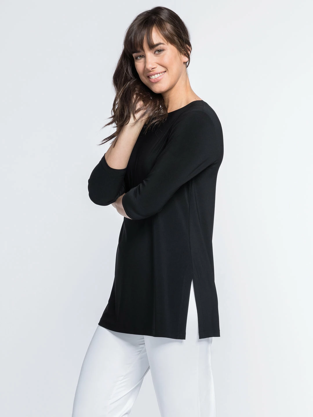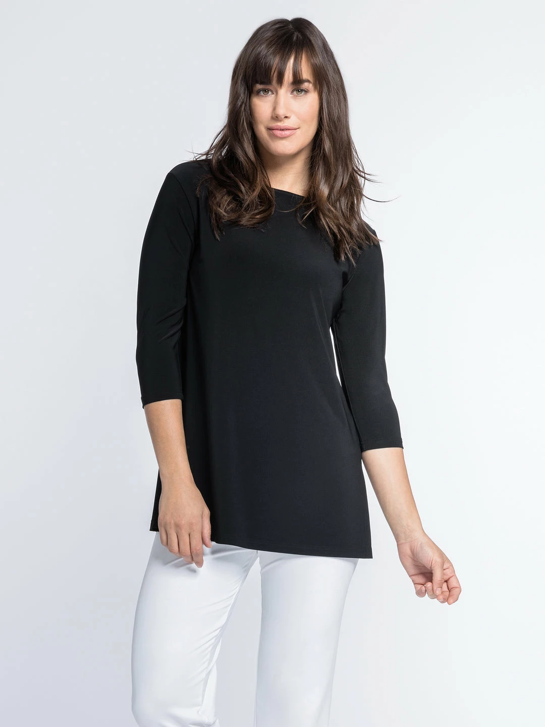 A Sympli essential, this basic tunic has a relaxed but straight fit, with a high round neckline and three quarter sleeves. Even hemline with side slit vents.