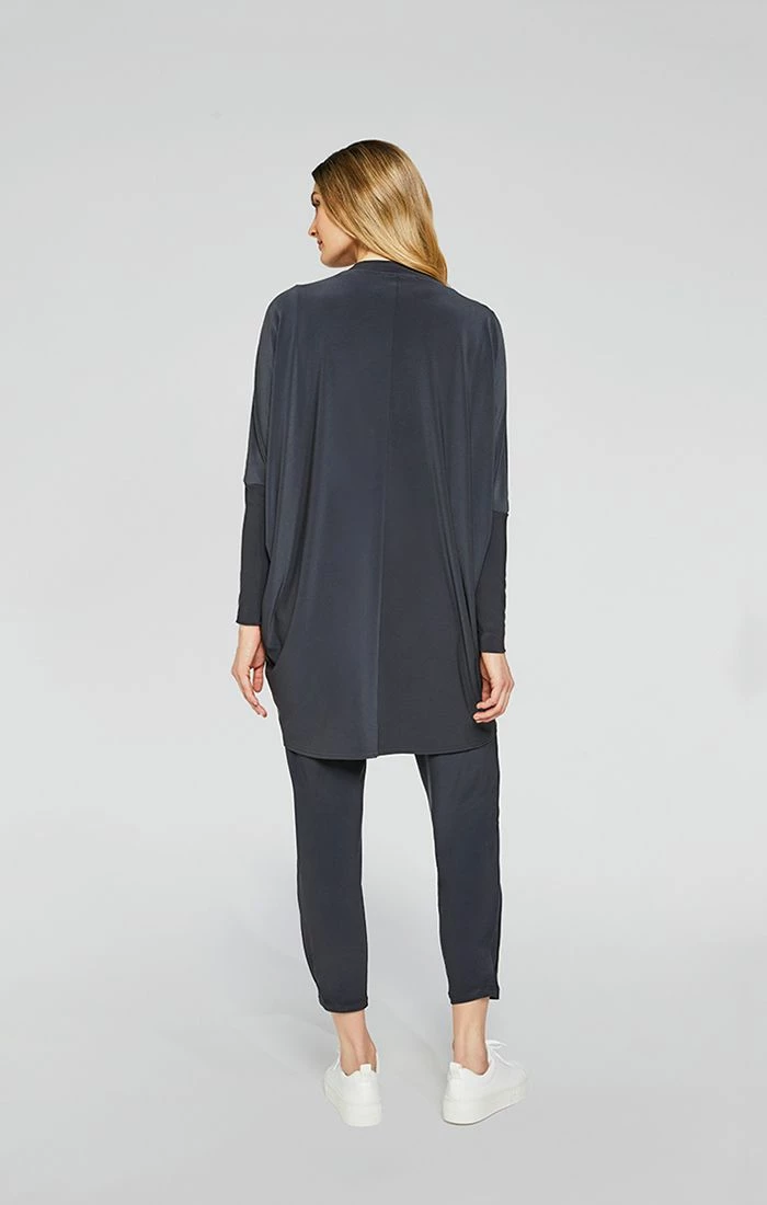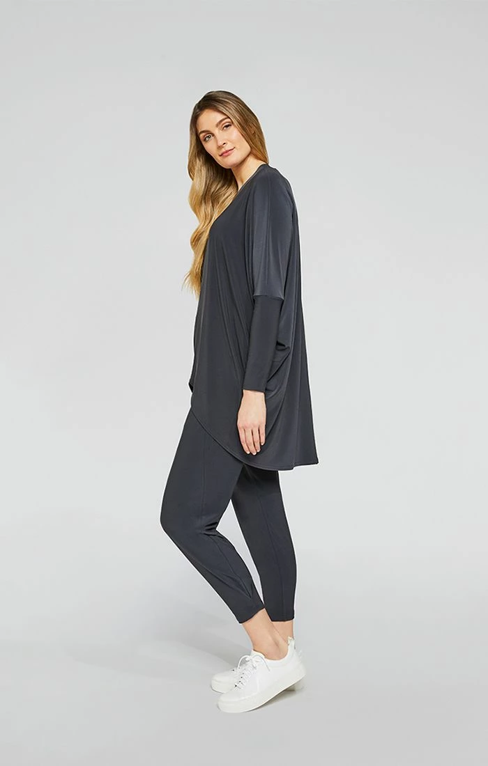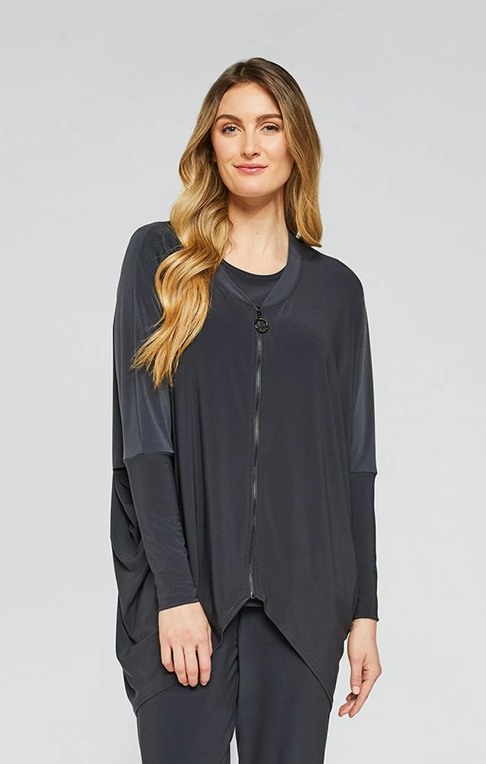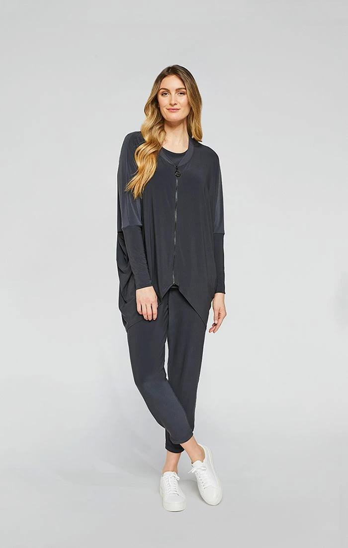 Sympli’s Zest Boxy Tunic brings contemporary styling with a generous oversized body that tapers to hemline and dropped fitted long sleeves. The full zip front features a round logo zipper pull, with a curved high low hemline and round neckline.Â