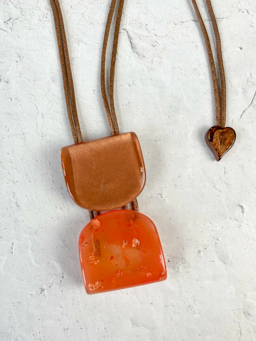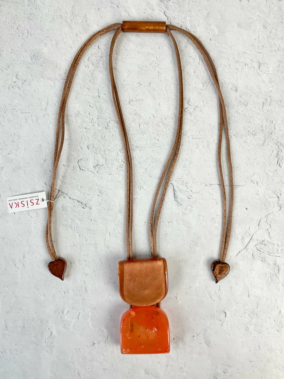 From Zsiska’s “Ava” capsule, this adjustable necklace features a two piece pendant, with a shimmering metallic bead and colored transparenet bead with coordinating metallic flecks, strung on coordinating fabric cord with adjustable pulls.
