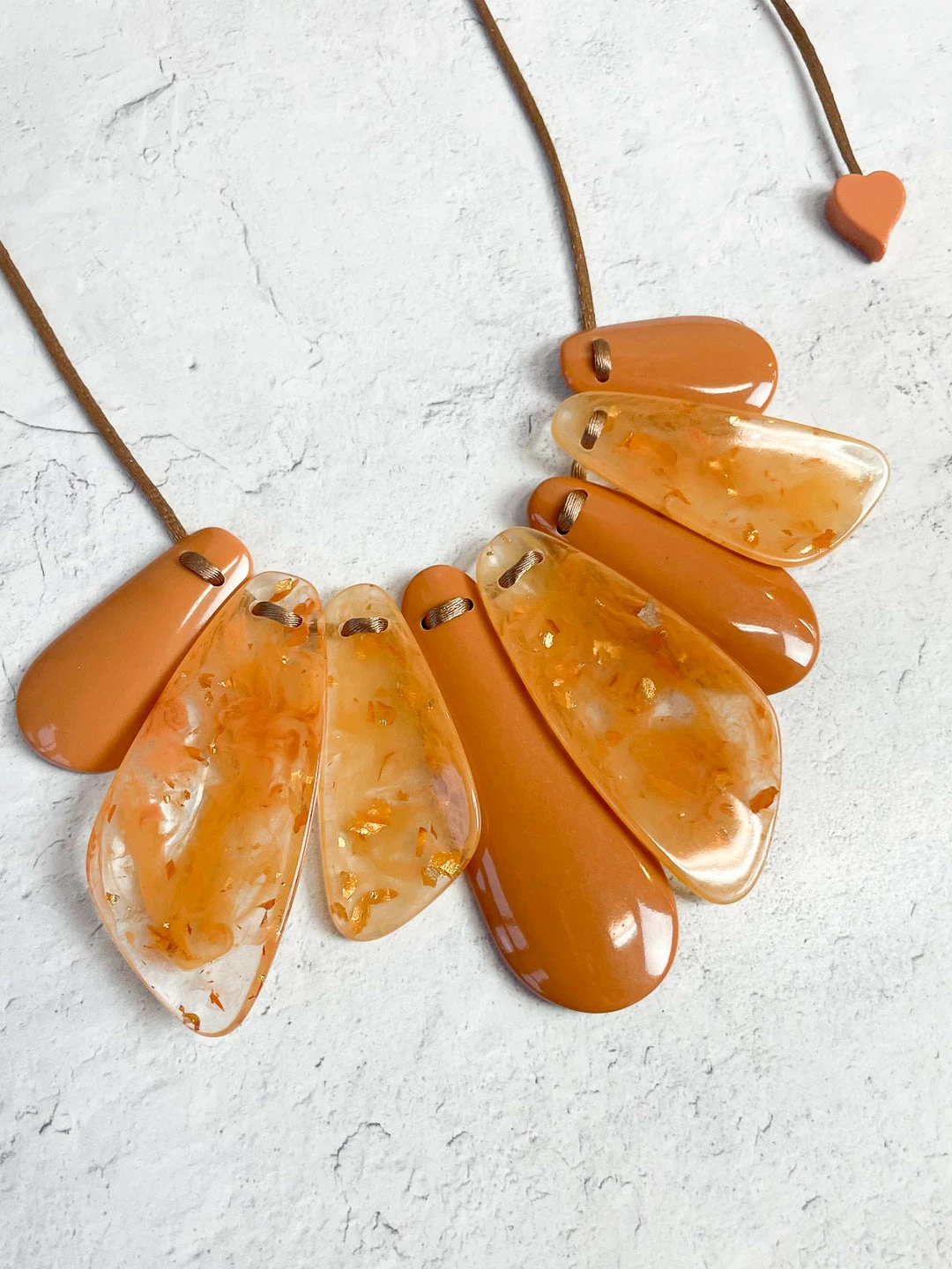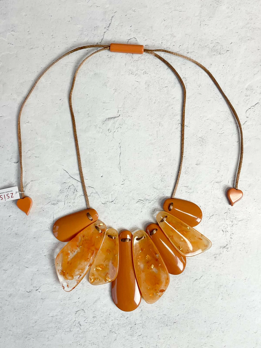 From Zsiska’s “Kamala” collection, this adjustable bib style necklace features eight resin pieces in a mix of translucent marbled resin dotted with metallic flecks and coordinating solid resin. On a matching fabric cord.Â
