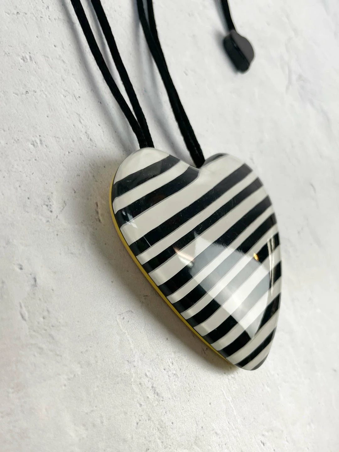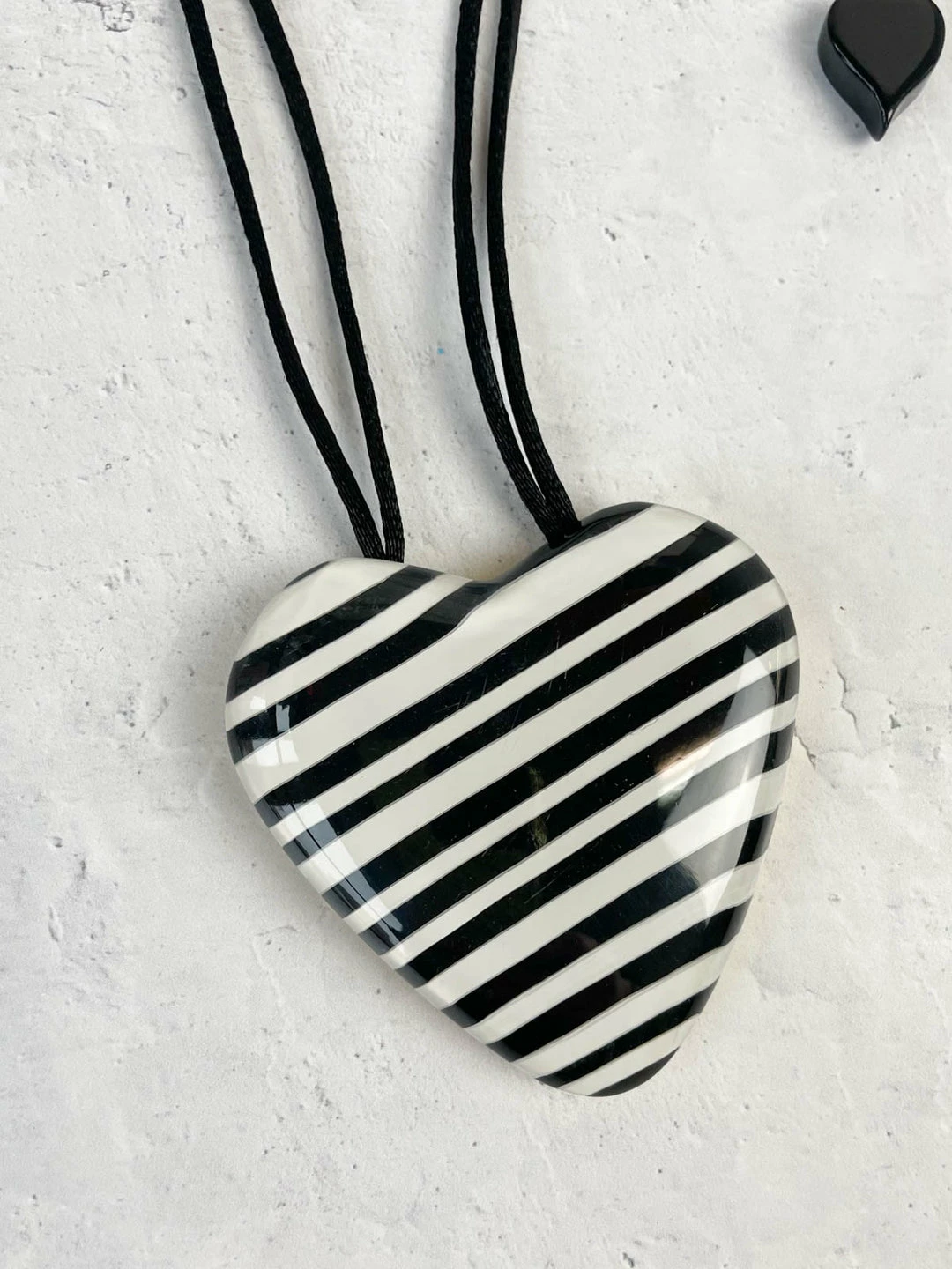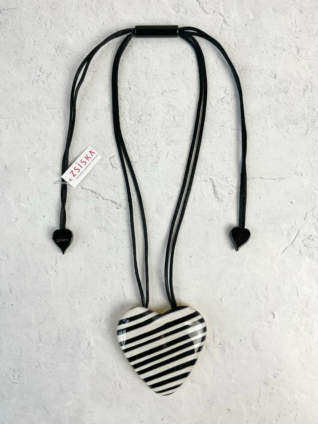 Zsiska’s “Olivia” collection stands out with a mix of striped beads and primary colors. This adjustable necklace features a heart shaped pendant on fabric cord, with adjustable pulls. Front is striped, while the back is solid color, giving a little peek of color on the sides. Try wearing on the reverse for a different look, too!